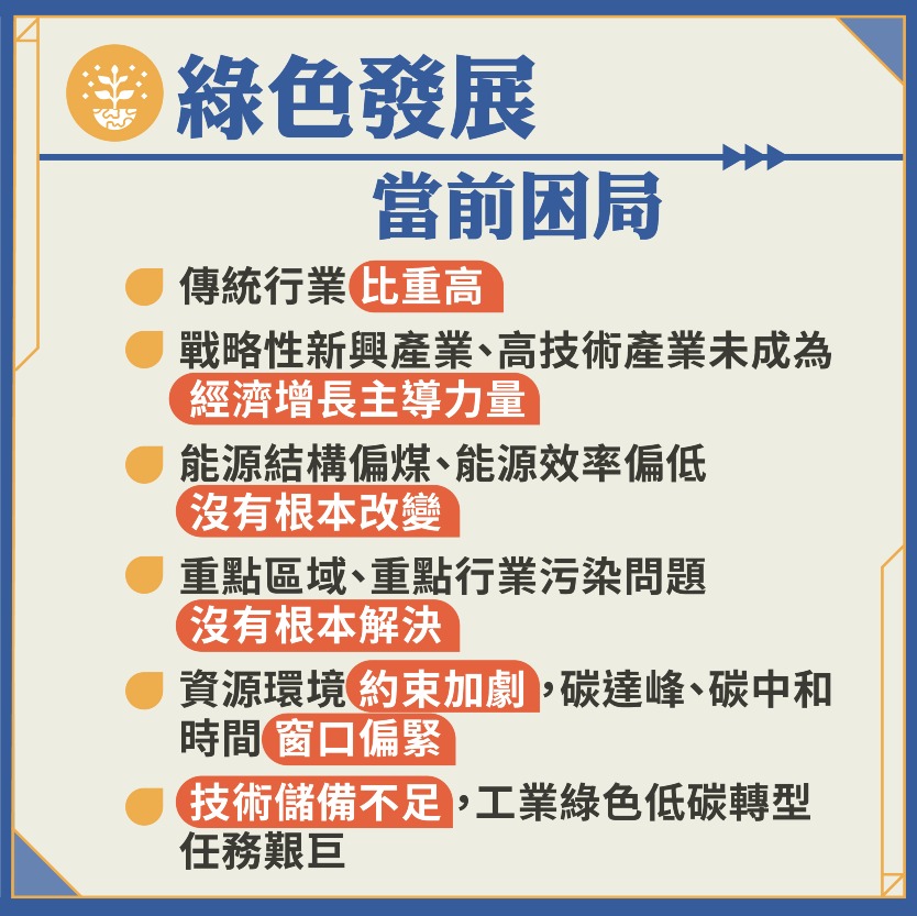 当局认为,中国当前仍处于工业化、城镇化深入发展阶段,绿色发展存在一定困局。同时,绿色低碳发展却是当今时代科技革命和产业变革的方向,绿色经济是全球产业竞争重点。