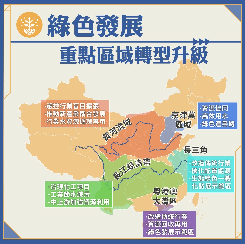 中国幅员辽阔,经济发展步伐不一,政府亦有特别举措平衡各地区的绿色发展,一方面提升能源资源富集地区的能源资源绿色供给能力,另一方面推动重点开发地区提高清洁能源利用比重和资源循环利用水平,并引导生态脆弱地区发展与资源环境相适宜的特色产业和生态产业。