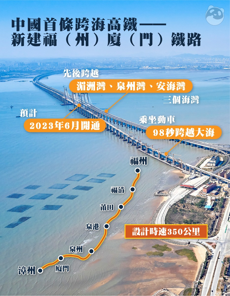 中国首条跨海高铁——福厦高铁预计于2023年通车,北起福州市,南至漳州市,横跨了湄洲湾、泉州湾、安海湾三个海湾。