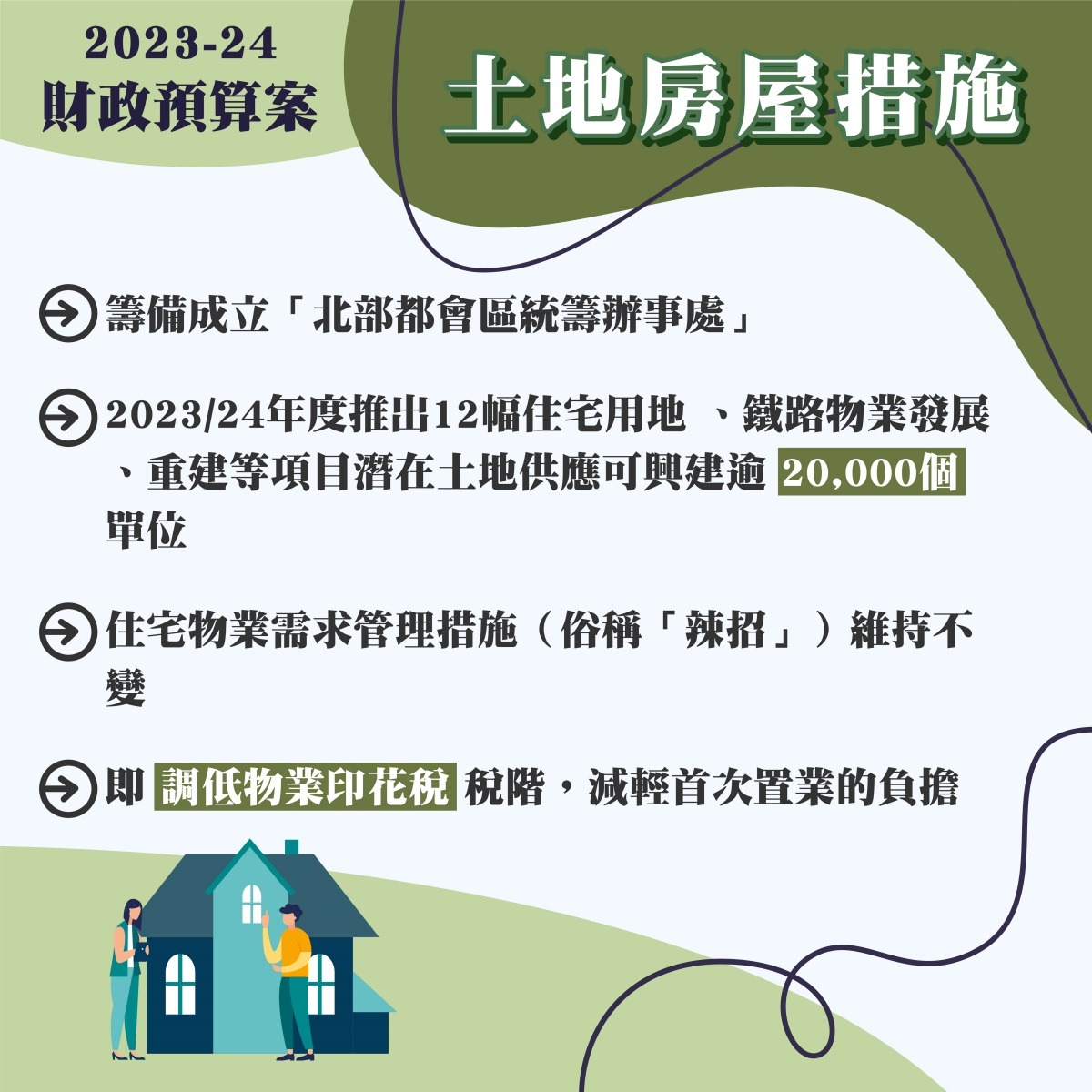 刊登日期 : 22/02/2023编辑︰许可 土地房屋是社会最关心的问题,“财爷”陈茂波在2023至24年度政府财政预算案中提出调低物业印花税税阶,助一般家庭首次置业;他又提出建设绿色城市,争取香港在2050年前实现碳中和。 延伸阅读:香港财政预算案懒人包 一文看清香港如何对接国家发展战略?
