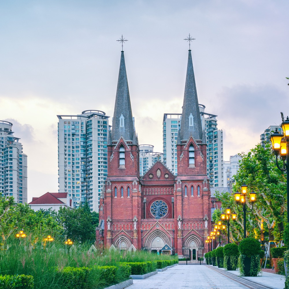 徐家汇天主堂是中国著名的天主教堂,是二十世纪初远东第一大教堂,现为天主教上海教区主教座堂,正式名称为“圣母为天主之母之堂”,堂侧有天主教上海教区主教府、修女院。始建于清光绪22年(公元1896年)的徐家汇天主堂楼高五层,为哥德式的双塔建筑。教堂主楼以石柱型砖木为主结构,两座钟楼分别高达57米,教堂坐西面东,选用红砖砌筑,花岗岩镶边,石墨瓦覆顶,无论是上面的窗口还是下面的大门,一律皆是子弹头状的圆顶设计,门窗上的玻璃色彩艳丽、样式精美,尽显欧式建筑风格,不愧为上海的地标性建筑。