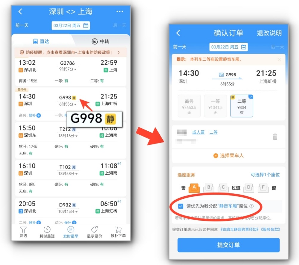 Not many trains have quiet carriages. Passengers need to find trains with a "quiet" sign (left) and choose "Please prioritise assigning me to a 'quiet carriage' seat" when buying tickets (right). (By Our China Story)