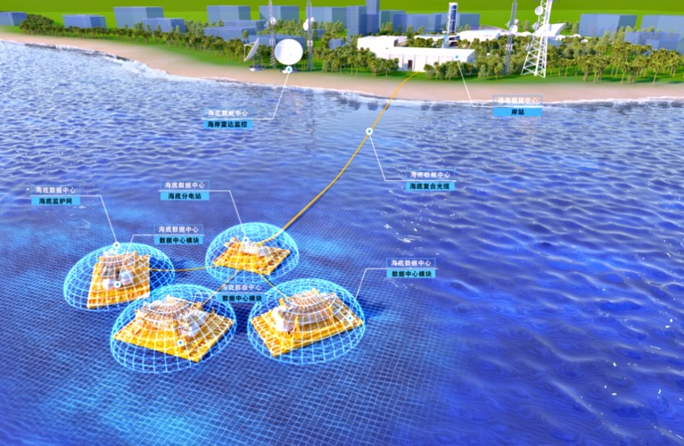 The underwater data centre system is based on the coast and seabed, consisting of a shore station, an underwater high voltage compound cable, an underwater substation, and a data capsule.