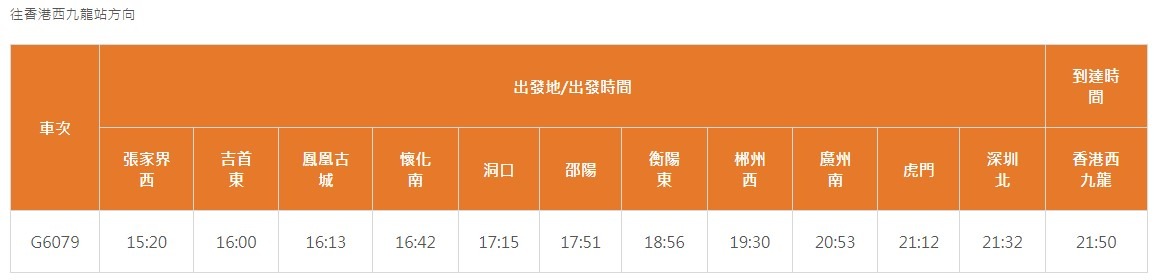 The full route is: West Kowloon - Shenzhen North - Humen - Guangzhou South - Chenzhou West - Hengyang East - Shaoyang - Dongkou - Huaihua South - Fenghuang Ancient City - Jishou East - Zhangjiajie West.