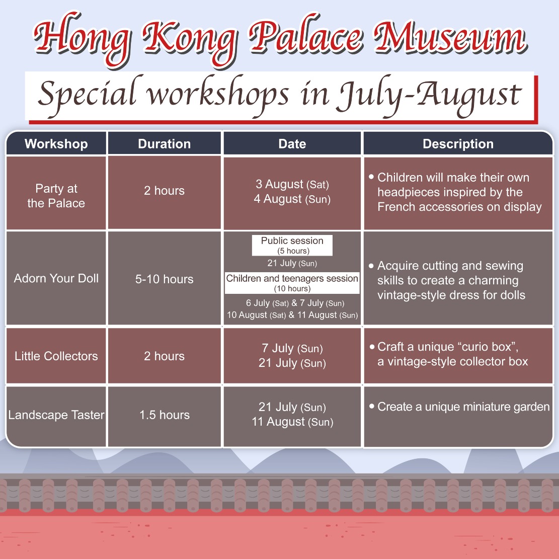 Meanwhile, the Hong Kong Palace Museum will also host a series of special workshops, allowing more people to learn the stories behind the exhibits and embark on an immersive museum tour. The workshop contents are as follows:
