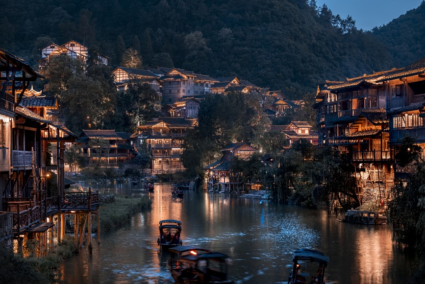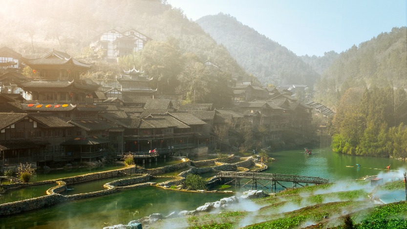 The Wujiang River flows through the village like a jade ribbon, on both sides are stilted buildings standing in rows.