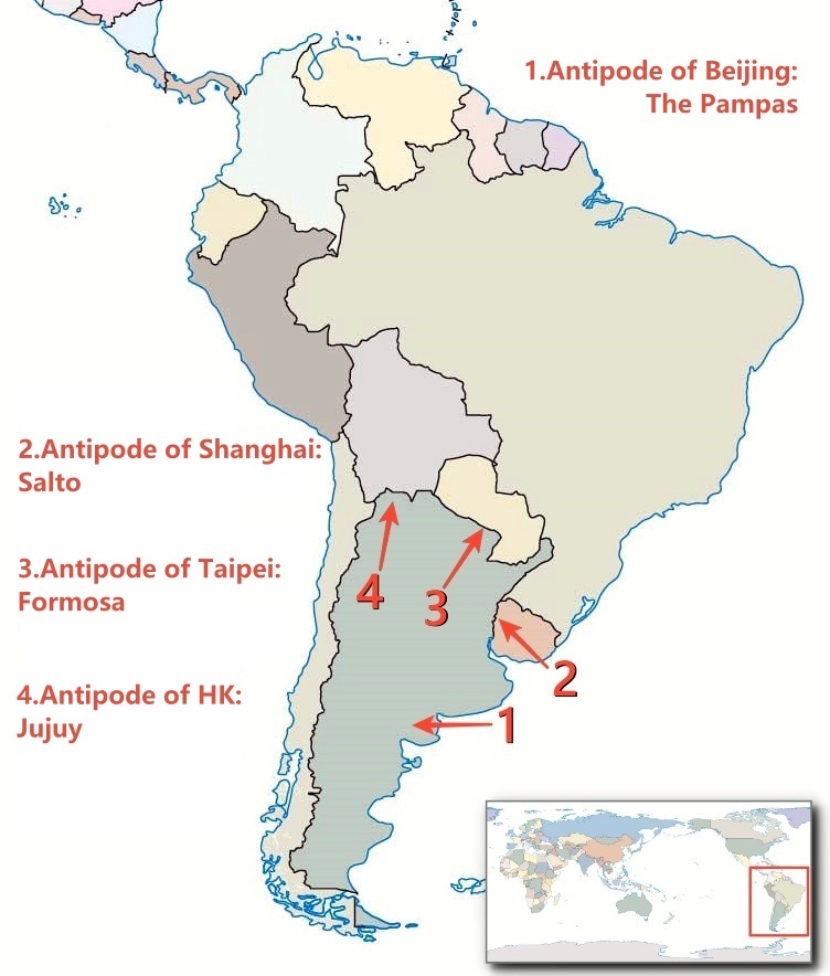 For example, the antipodes of Shanghai are in Uruguay, near Salto in the northwest of the country, close to the Argentine border; likewise, the antipodes of Taipei are in Argentina, but the "back side" of the entire island of Taiwan is mainly in Paraguay.