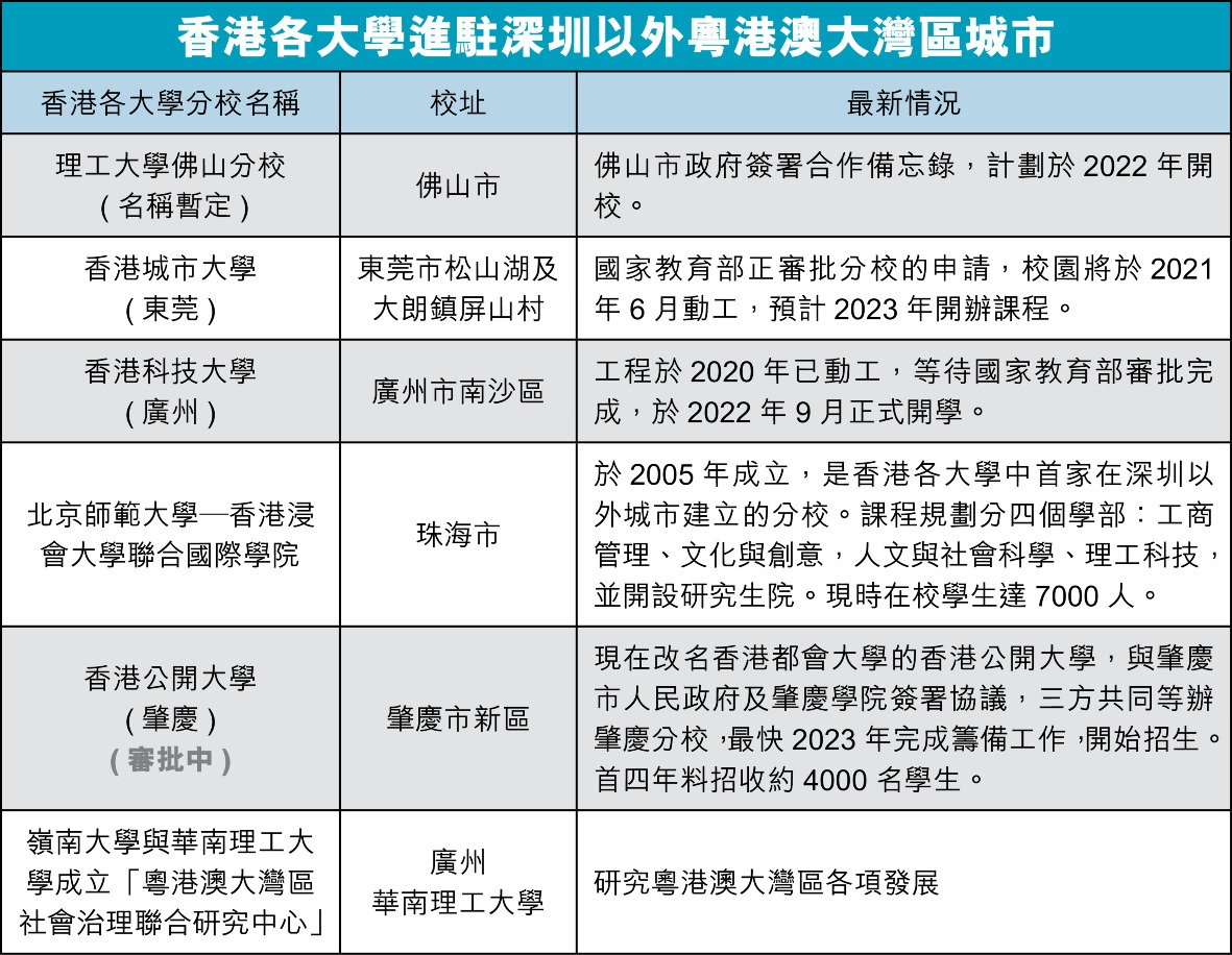 香港特區政府近年積極鼓勵香港的高等院校到粵港澳大灣區辦學,早年各大學普遍都在深圳生根,而當粵港澳大灣區其他地區不斷發展後,大學便都積極籌辦在其他城市辦學,教授來自五湖四海,知識根基深而廣濶,課程更是兩地認受,是學生接觸未來世界的好機會。