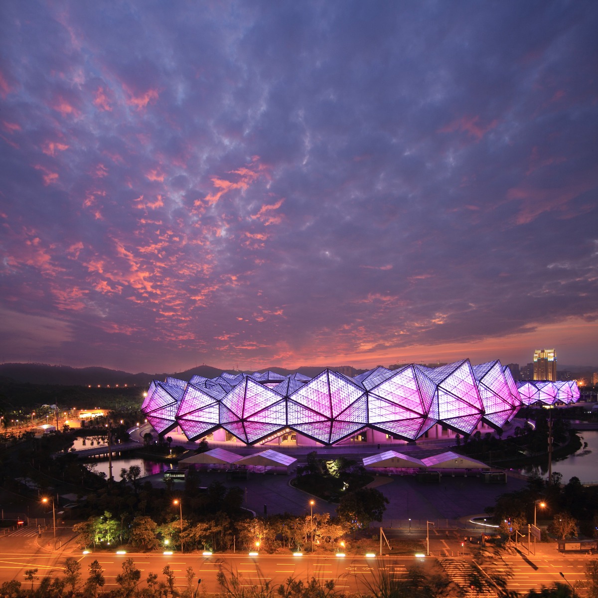 體育中心外面是白色巨型綱結構架將中心內所有場館包住,依傍海濱15公里的優美形態,像春天結的「繭」,因此有「春繭」的美名。
