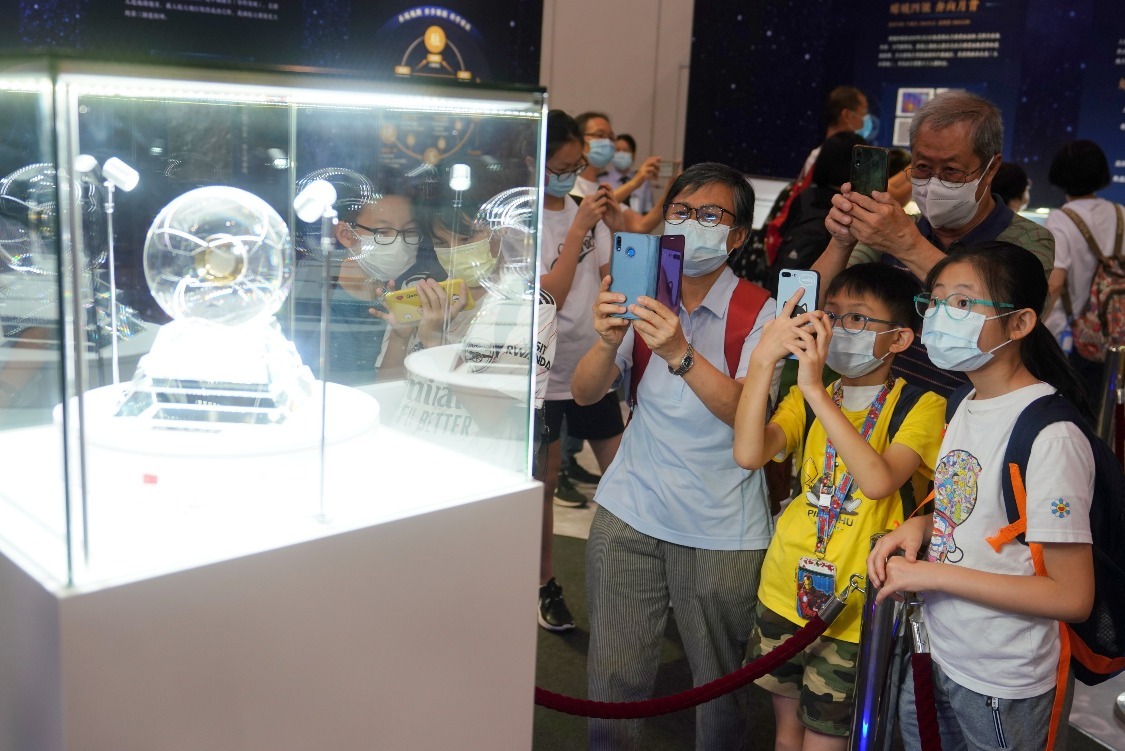 月壤得來不易,嫦娥五號採集的1.7千克月壤被分成30多份交給不同的科研機構分頭研究,部分則用於科普展覽。圖為2021年6月,部分月壤運至香港供市民參觀。(圖片來源:視覺中國)