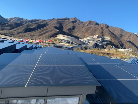五棵松冰上運動中心、國家速滑館、延慶賽區山地新聞中心等場館,在屋頂安裝了光伏發電系統。當中,五棵松冰上運動中心的屋面發電系統,年供電量達到70萬千瓦時,節能率達到77.1%,是當前世界上最大的超低能耗公共建築。延慶賽區山地新聞中心,採用64個透光天窗,安裝了256塊特製光伏發電板,年發電量達14萬千瓦時,相當於每年減排約90噸二氧化碳。