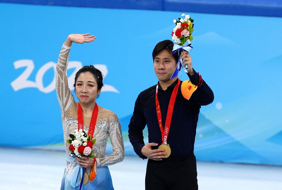 【花樣滑冰雙人滑 中國隊奪金】在花樣滑冰雙人滑項目中,中國組合隋文靜、韓聰發揮出色,以自由滑155.47分、總分239.88力壓兩對俄羅斯奧委會勁敵,贏得金牌。自此,他們了集齊四大洲、世錦賽和奧運會金牌,成就大滿貫。