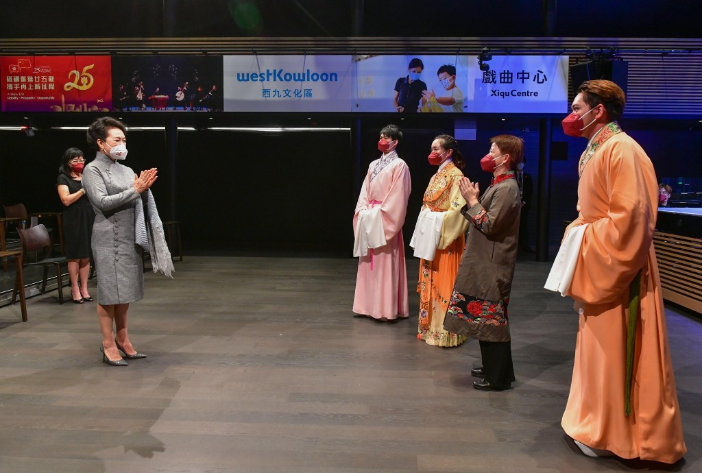 習近平夫人彭麗媛就到訪西九文化區戲曲中心,與年輕粵劇演員、樂團成員和義工交流。觀賞粵劇折子戲綵排時,彭麗媛看得非常投入,並以「台上一分鐘,台下十年功」,稱讚年輕粵劇演員表演專業,鼓勵他們繼續努力,弘揚中國戲曲文化。