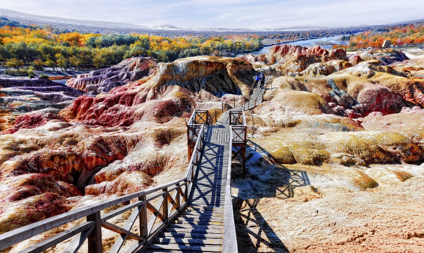值得一提,五彩灘是個典型的古湖盆沉積岩層,經過萬年水沖風蝕,形成數百座深紅、赭紅、石青、鵝黃、黛綠及青灰等色彩鮮艷的泥層岩。