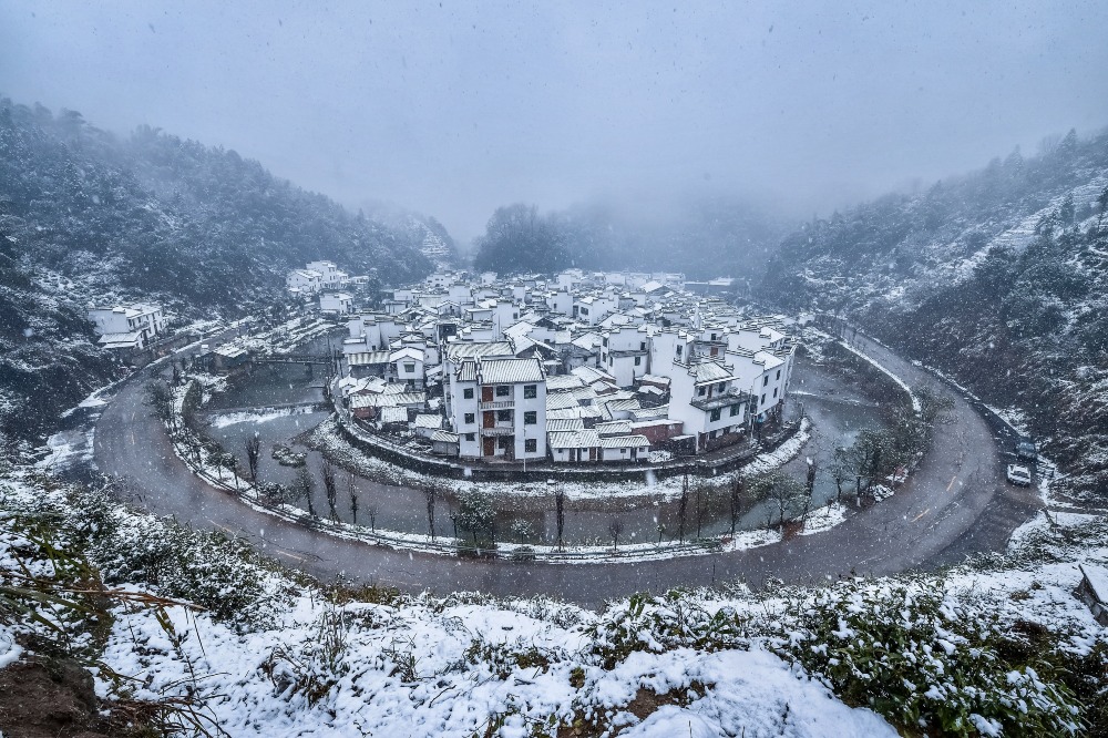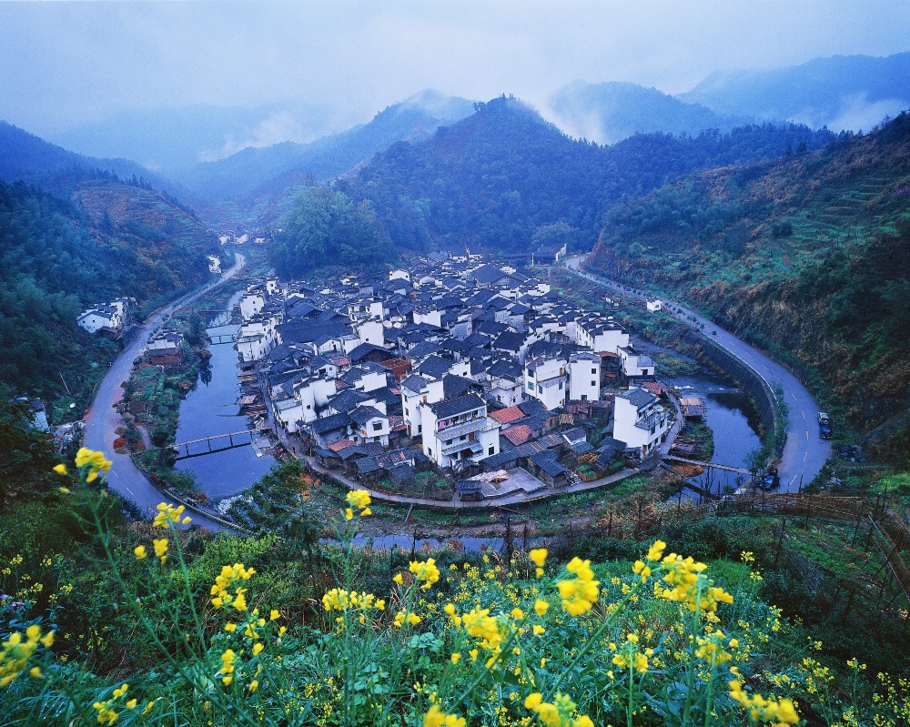 菊徑村位於江西省婺源縣大鄣山鄉,地形非常獨特,群山環繞,三面環水,新修的公路沿着河岸從村前繞過,俯瞰全景,就是一個大大的「圓」,因此被稱為「中國最圓的村莊」。