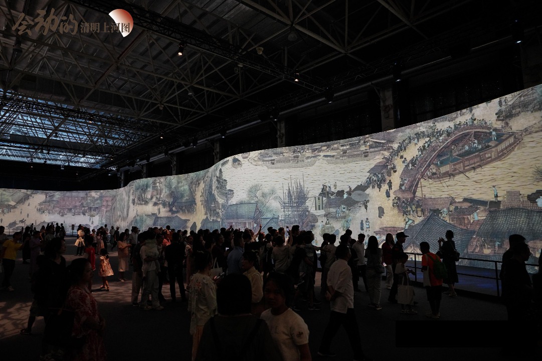 是次展出的動態版《清明上河圖》長卷,長128米,高6.8米,以宋代風俗畫鉅作《清明上河圖》作為藍本,將原作放大了數百倍,利用數字化技術,生動地重現北宋都城汴京兩岸的繁榮盛景及眾生百態,讓文物煥發生機。