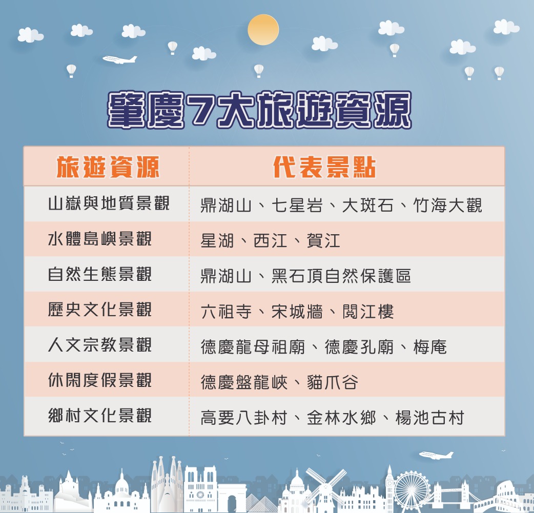 肇慶的旅遊資源豐富多元,整體可劃分為7大類,分別是山嶽與地質景觀、水體島嶼景觀、自然生態景觀、歷史文化景觀、人文宗教景觀、休閑度假景觀和鄉村文化景觀。