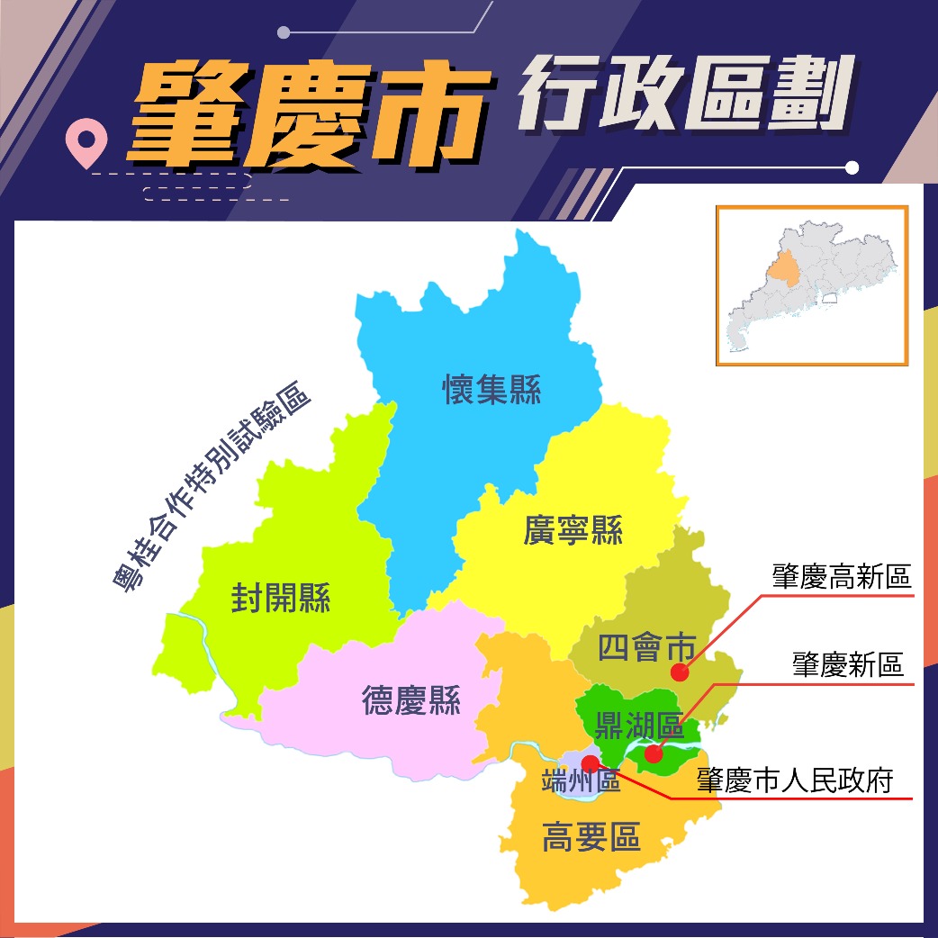 設有3個市轄區(端州區、鼎湖區、高要區)、4個縣(廣寧縣、德慶縣、封開縣、懷集縣)、代管1個縣級市(四會市)以及3個功能區(肇慶高新區、肇慶新區、粵桂合作特別試驗區)。
