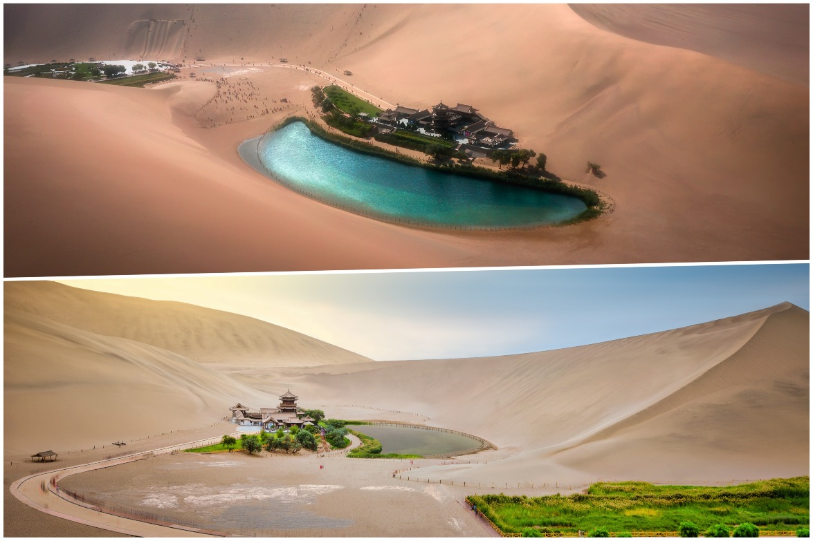 而月牙泉則坐落於鳴沙山山腳下,被連綿沙山所環抱,因形似月牙而得名。