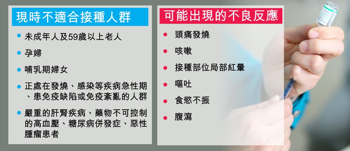 而根據官方發布的新冠疫苗接種指南,現時適合接種國產疫苗年齡層介乎18到59歲,並未包括未成年人及長者,相信是要等待疫苗臨床數據的進一步披露,以確保接種者的安全。另外,孕婦、哺乳期婦女、出現發燒和感染的急性病患者、惡性腫瘤患者等等,都不能接種新冠疫苗。