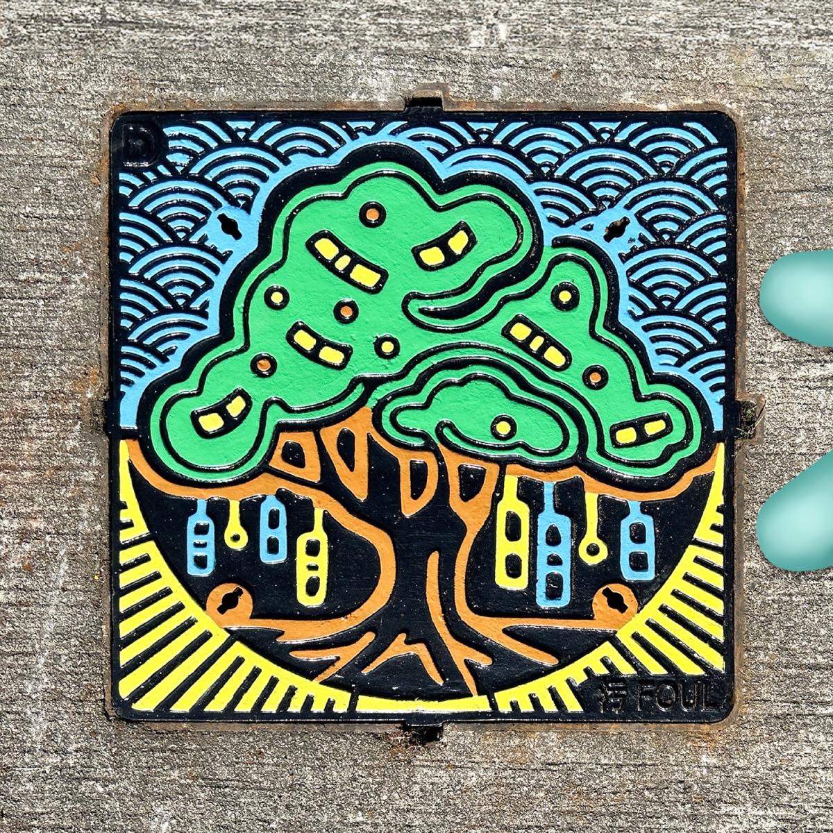 剛過去的農曆新年假期,不少市民到大埔林村參加節慶活動祈福。除了抬頭向許願樹拋寶牒,今年林村鄉公所路及許願廣場附近,亦有不少人低頭「打卡」,鏡頭下方正是渠務署新裝設、以「許願樹」為題的彩色渠蓋。