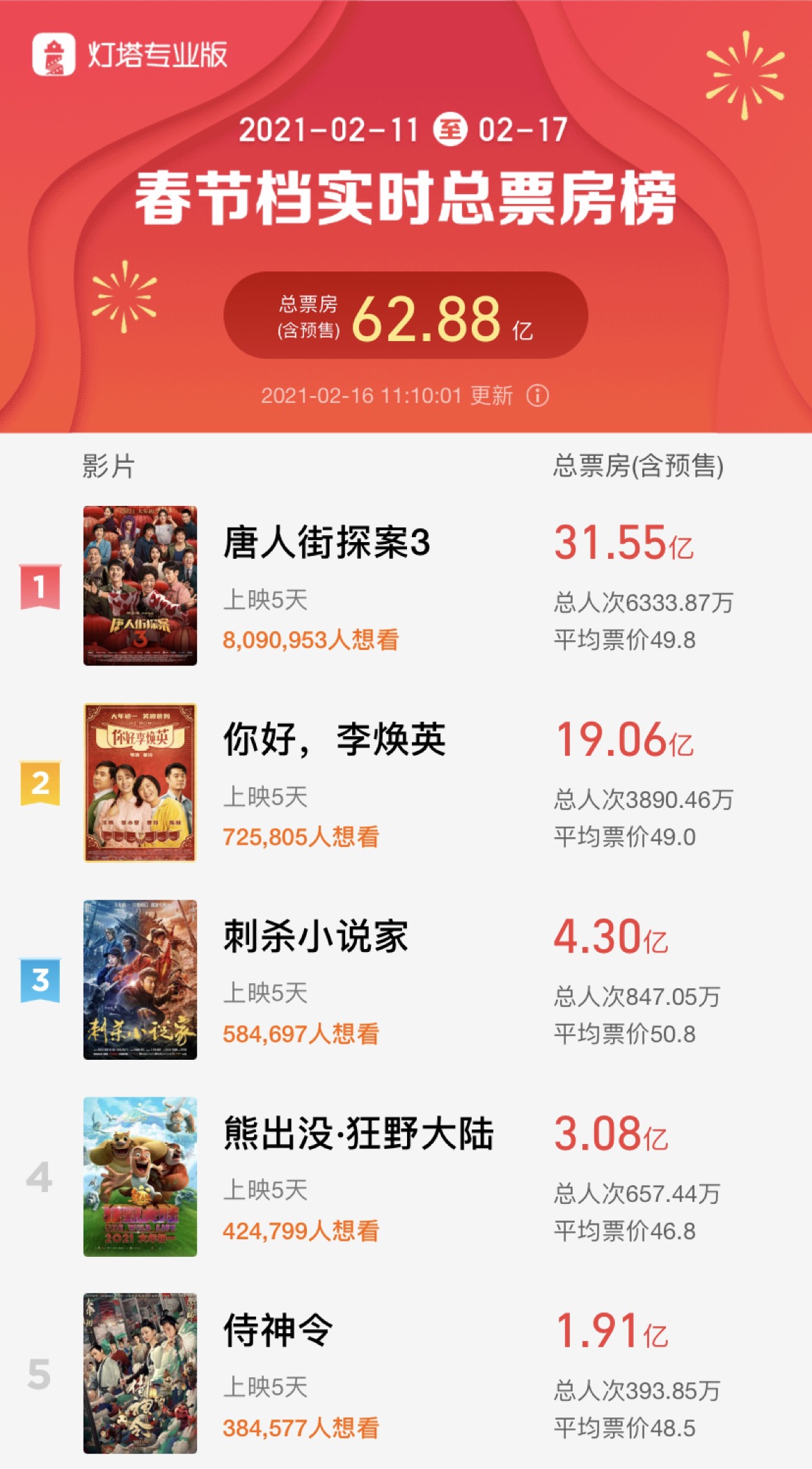 由於疫情關係,內地在2020年並沒有電影春節檔,因此今次是春節檔時隔一年後的回歸,熱烈程度更超以往。截至2月16日年初五早上11時,內地春節檔總票房累計62.88億元,其中由王寶強、劉昊然主演的《唐人街探案3》以31.55億穩居票房第一,由賈玲自導自演的電影《你好,李煥英》則以19.06億票房排名第二,兩部電影包攬了超過8成的票房。