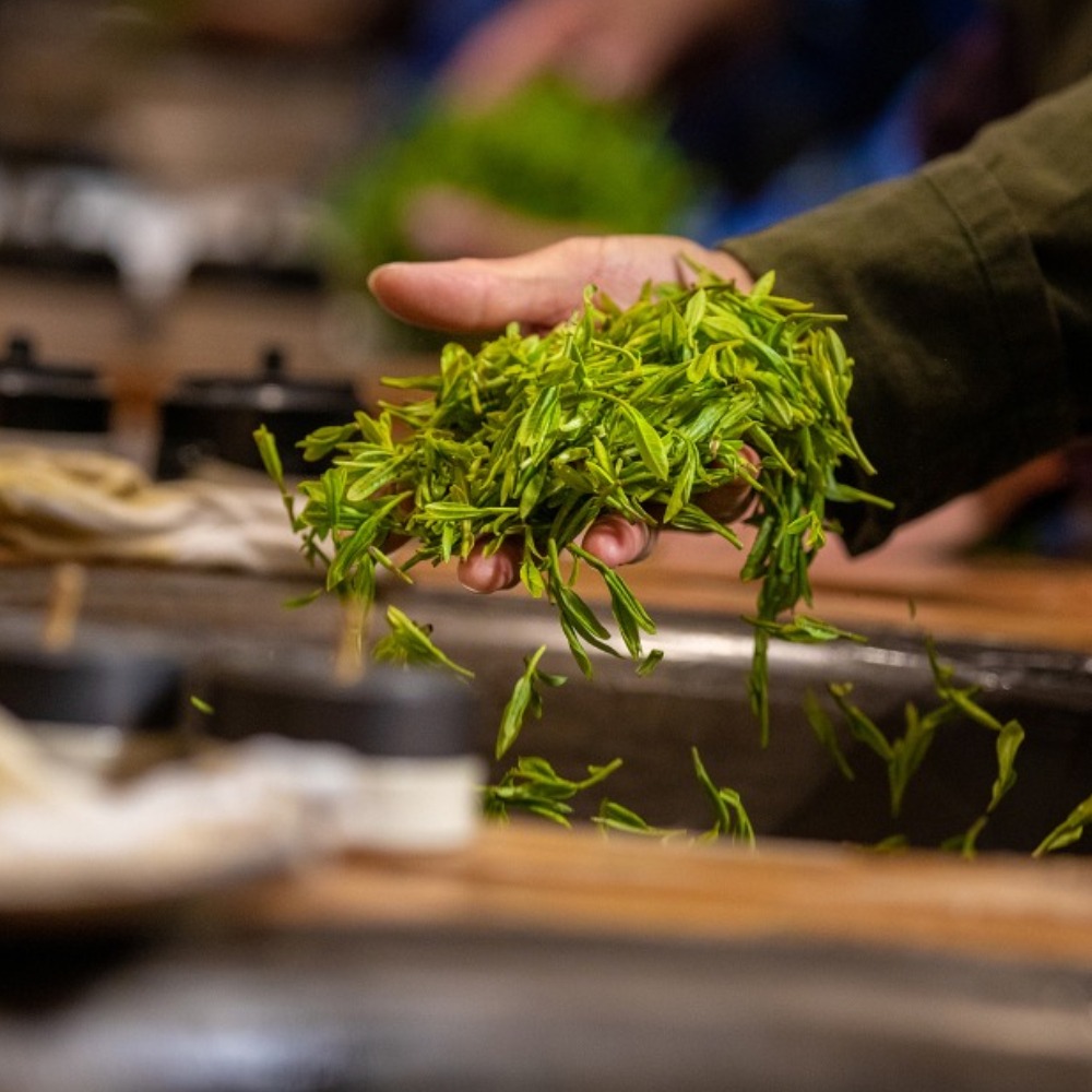 採摘下的鮮葉,要經過大約1小時的炒製。500克鮮葉通常可以製作100-150克幹茶葉。