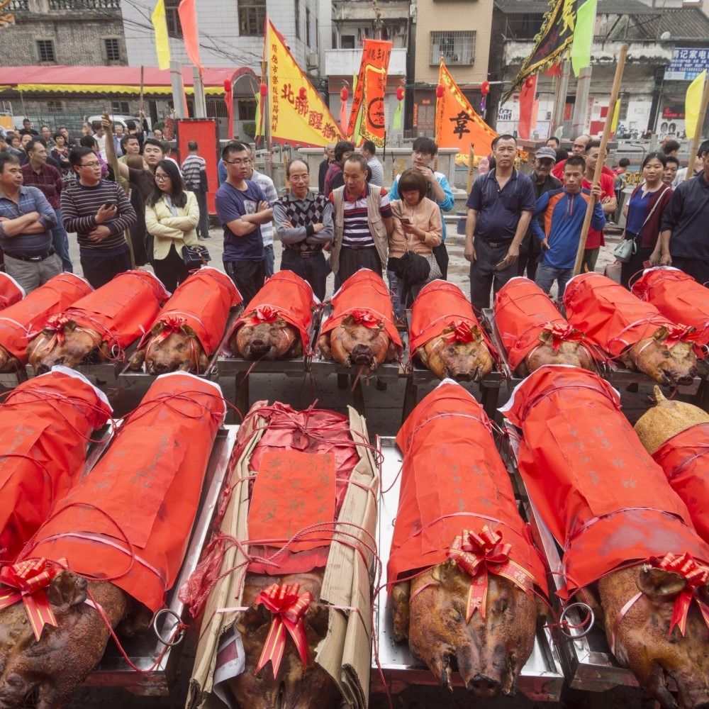 佛山人祭祖一般會準備五大類祭品,分別有燒金豬、紙錢元寶、蕎菜、鬆糕、甘蔗水果等。拜祭祖先後,會把燒豬即時分食,又稱為「太公分豬肉」,好讓各人帶回家吃後一家興旺。