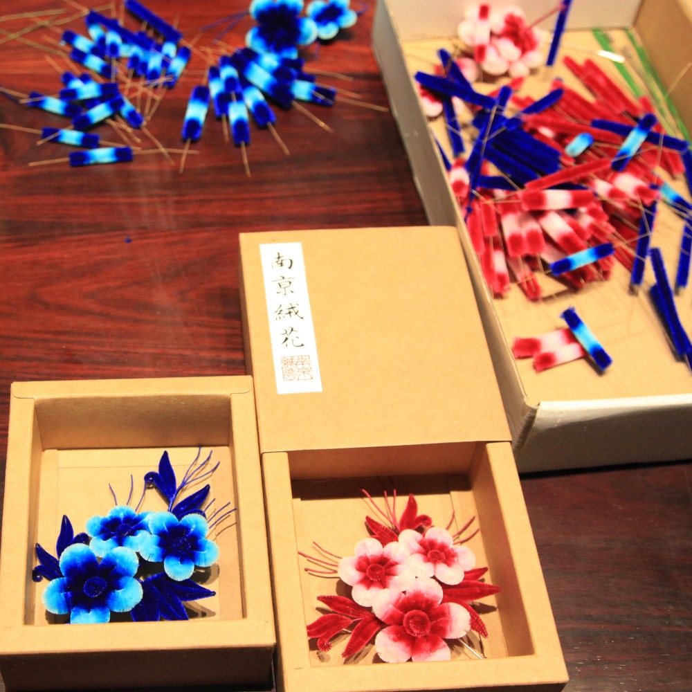 絨花工藝始於秦朝,色彩明麗、栩栩如生,唐時被列為皇家貢品,因諧音「榮華」成為中國文化傳統中富貴的代表。直至明末清初,絨花成為南京女孩們不可或缺的飾品,在春節、端午、中秋、婚嫁等重要節慶才會佩戴。