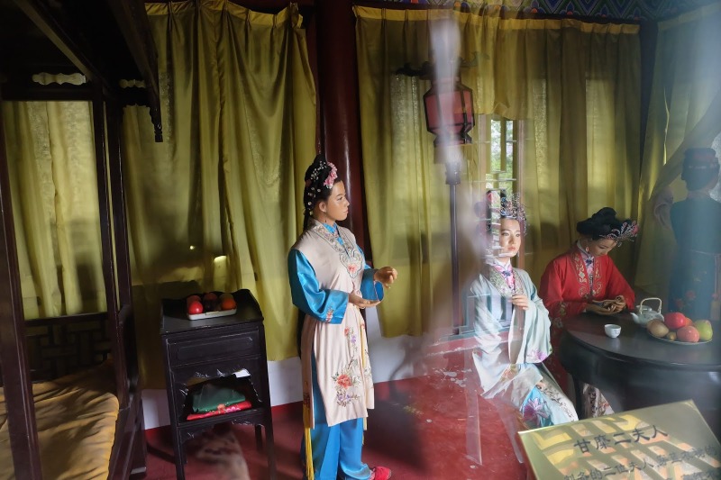 甘糜二位夫人住的里院,有二位嫂子的塑像。“问安亭”是关羽每天给二位嫂子请安的地方。在问安亭和甘糜二夫人居住的小楼之间有座竹林遮掩的假山池塘,名为“雷池”。关羽为避嫌,每天请安绝不跨过这座小池。只在问安亭远拜。后人把这段故事尊为君子“不越雷池一步”。