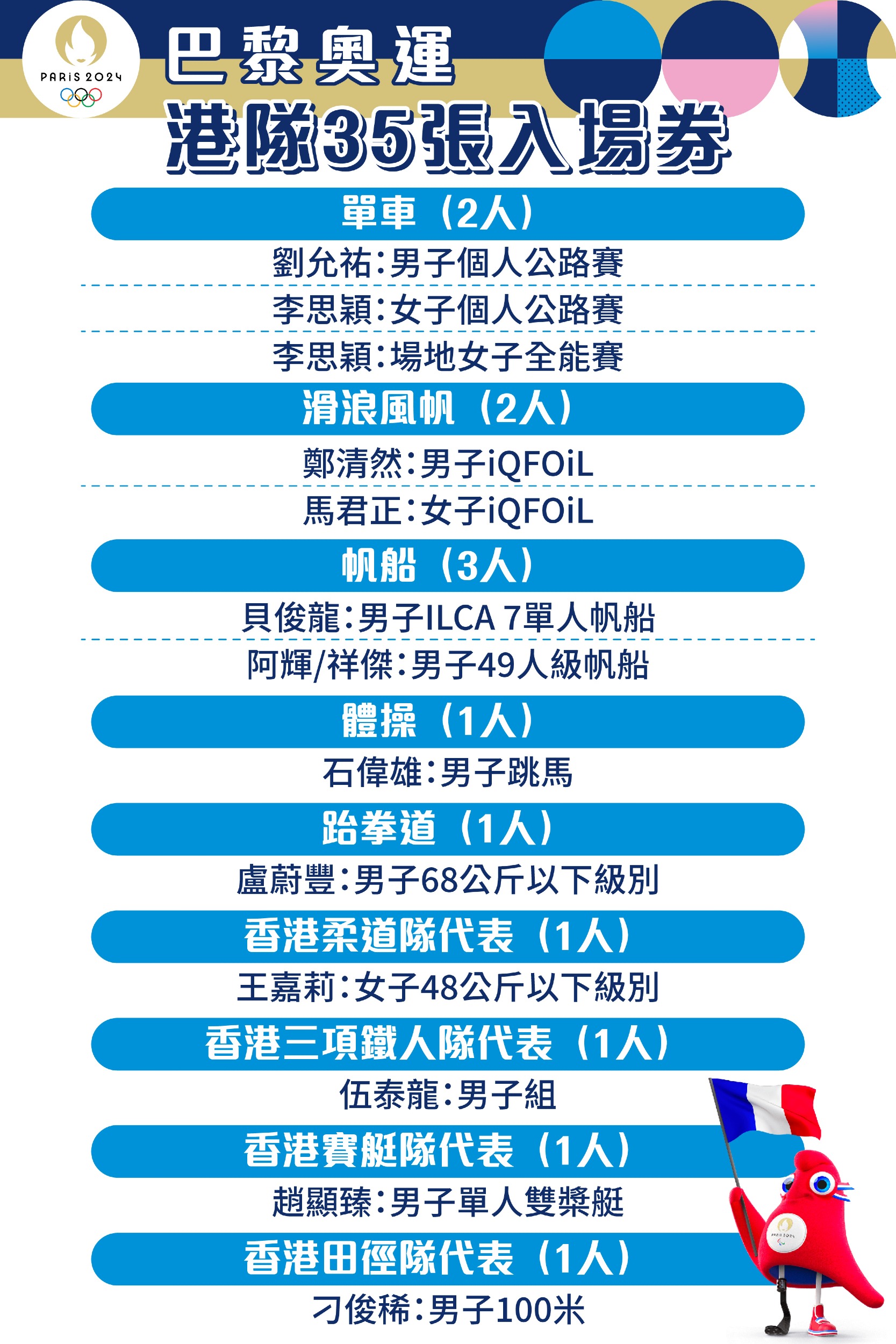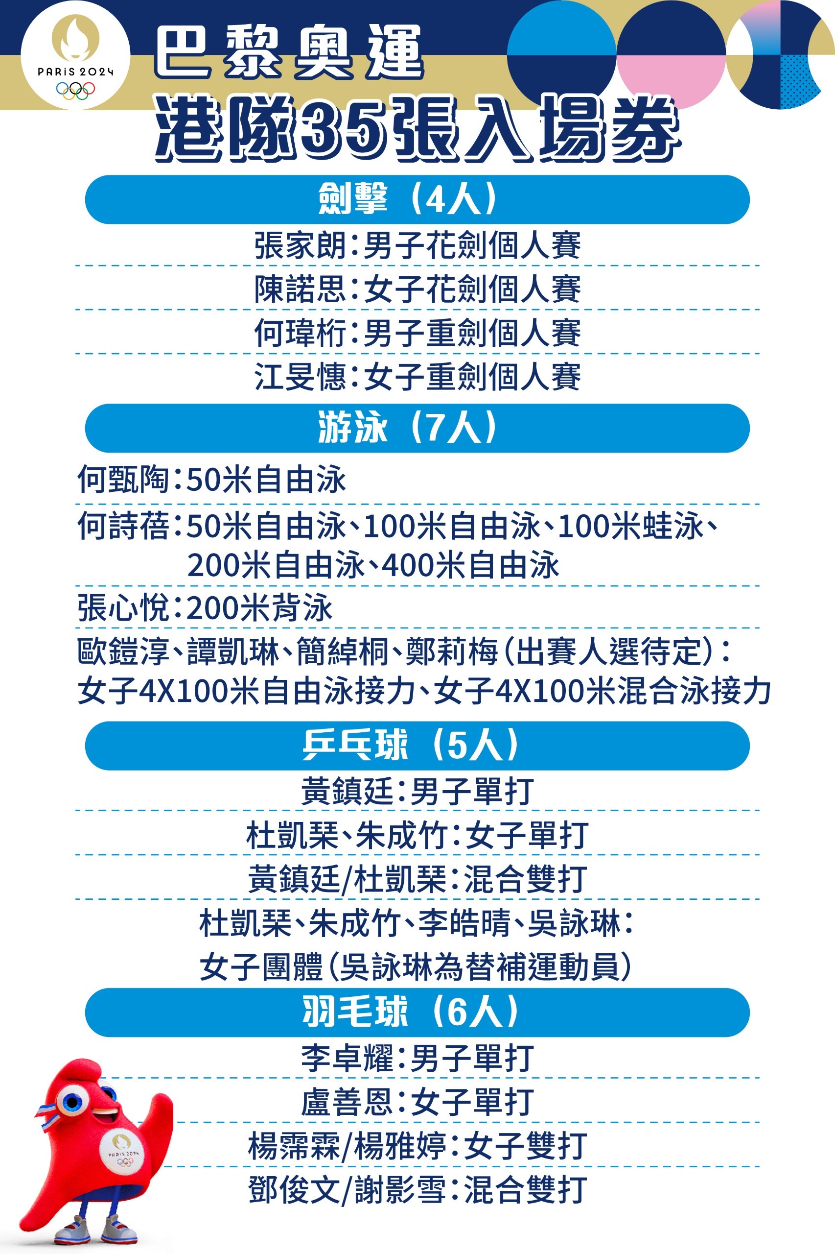 今届巴黎奥运,港队获得35张奥运入场券,由16男、19女共35位运动员出战13个项目。当中,包括多次征战奥运的张家朗、何诗蓓、谢影雪等,也有超过一半人是首次参加奥运。而张家朗和何诗蓓会担任奥运开幕礼的港队持旗手。