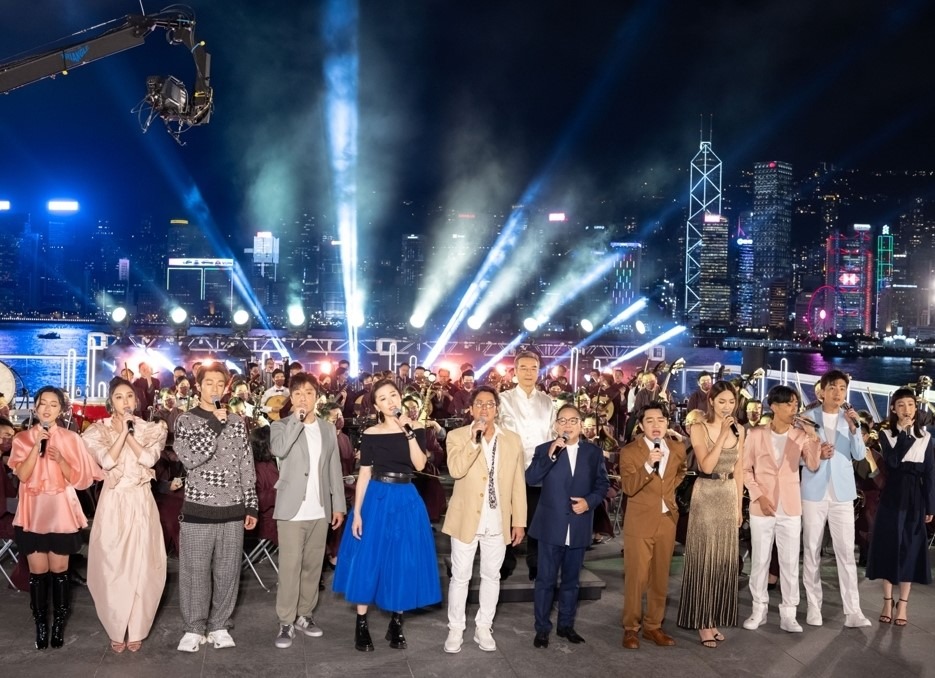 《湾区升明月》2021大湾区中秋电影音乐晚会,张明敏(右六)与众星合唱《我的中国心》。