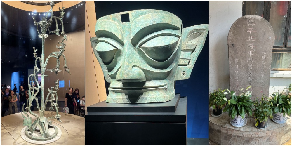 三星堆博物馆新馆中,共有3大常规展区,分别是“世纪逐梦”、“巍然王都”及“天地人神”,我们四川三国团一行人用了两个小时暴走3个展区。三星堆每一件文物都是镇馆之宝,大部分红透国内外的文物都在2楼,建议上午一开门就去,直奔2楼,这个时候人少,可以清楚的拍到神树、纵目面具、青铜立人等等。我们因为要赶路,才用两个小时极速走完,老实说只够拍照时间,如要认真的看非用4个小时不可。
