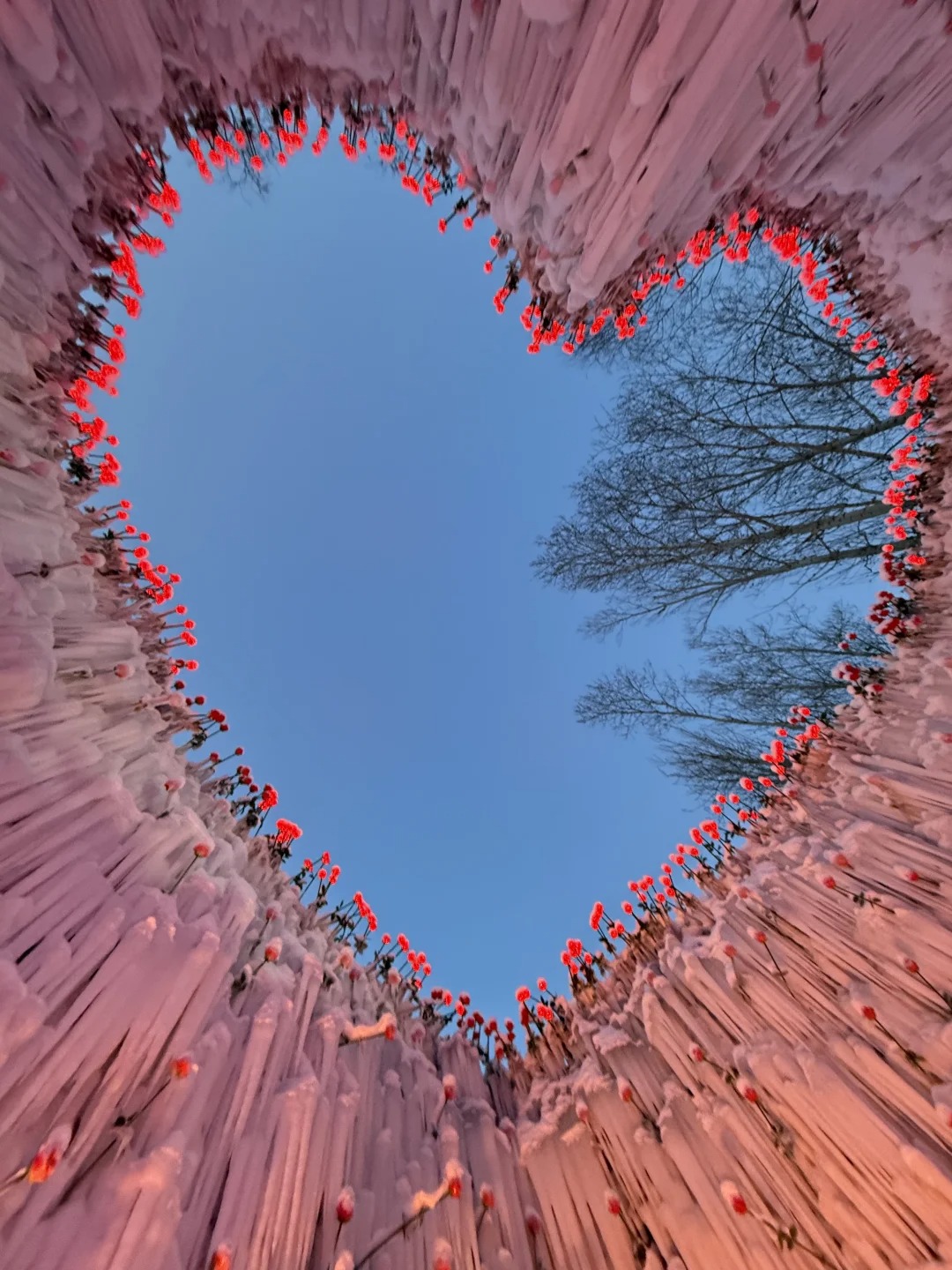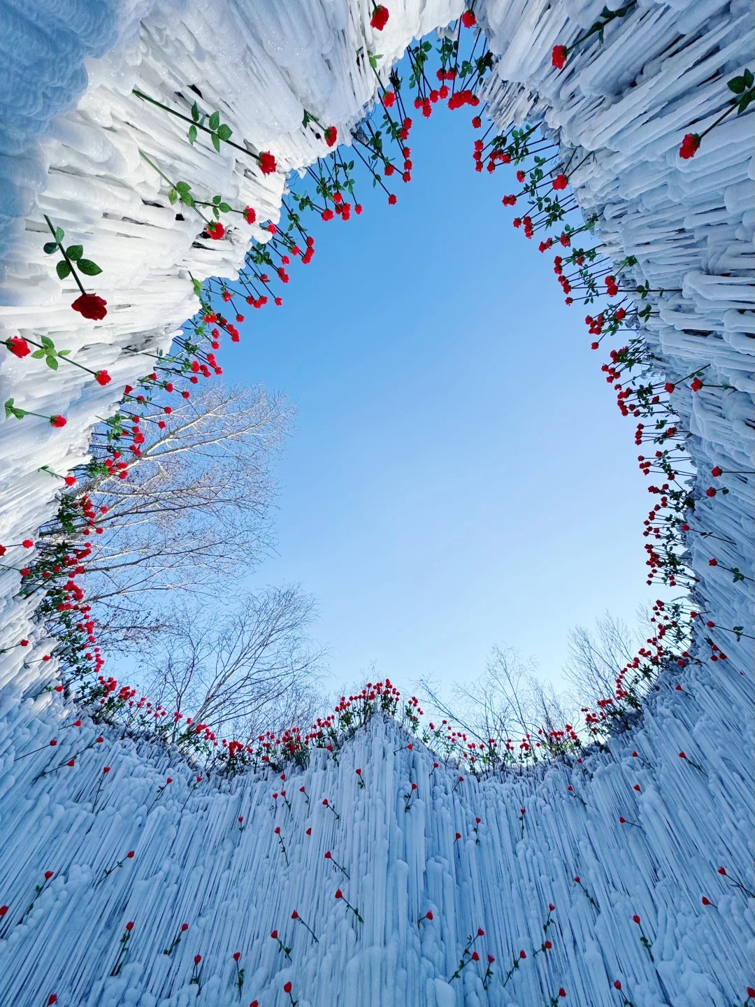 在长春雕塑园梦幻雪谷中,就有一座冰封玫瑰洞穴吸引了无数游客,只见洞穴内布满冰瀑,鲜艳的红玫瑰点缀其中,若抬头一看,还能以冰柱组成的心形镂空“天花板”,梦幻磅礴,非常浪漫!