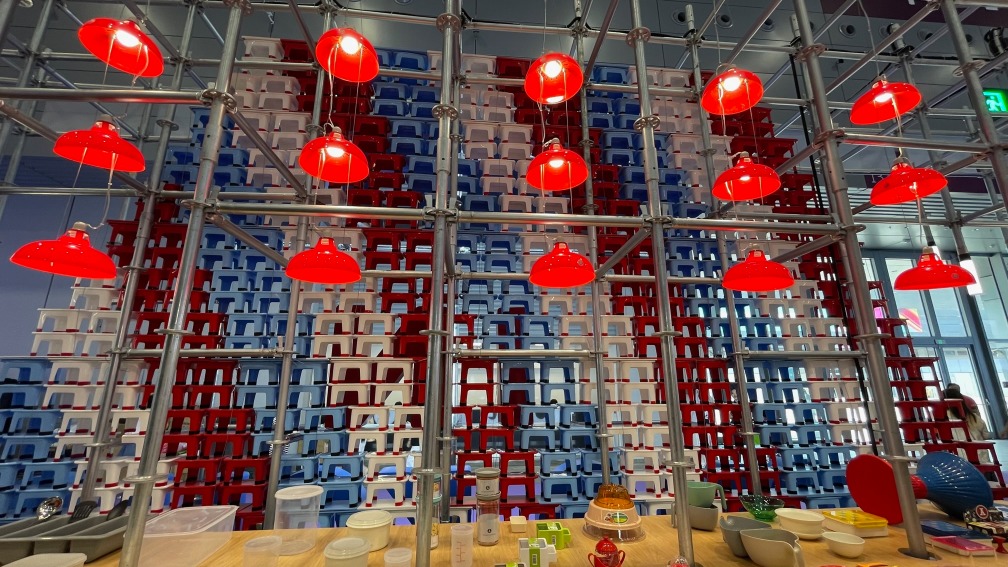 此区展示一系列香港经典品牌的新创作。必打卡的有骆驼牌经典暖水壶造型打卡墙、红A则有以超过700件经典矮櫈、漏斗櫈和灯罩砌成的巨大装置,与“MADE IN HONGKONG”字样互相辉映。此外,还有周大福的潮流首饰、型格生活用品等,打卡与购物都一样吸引。