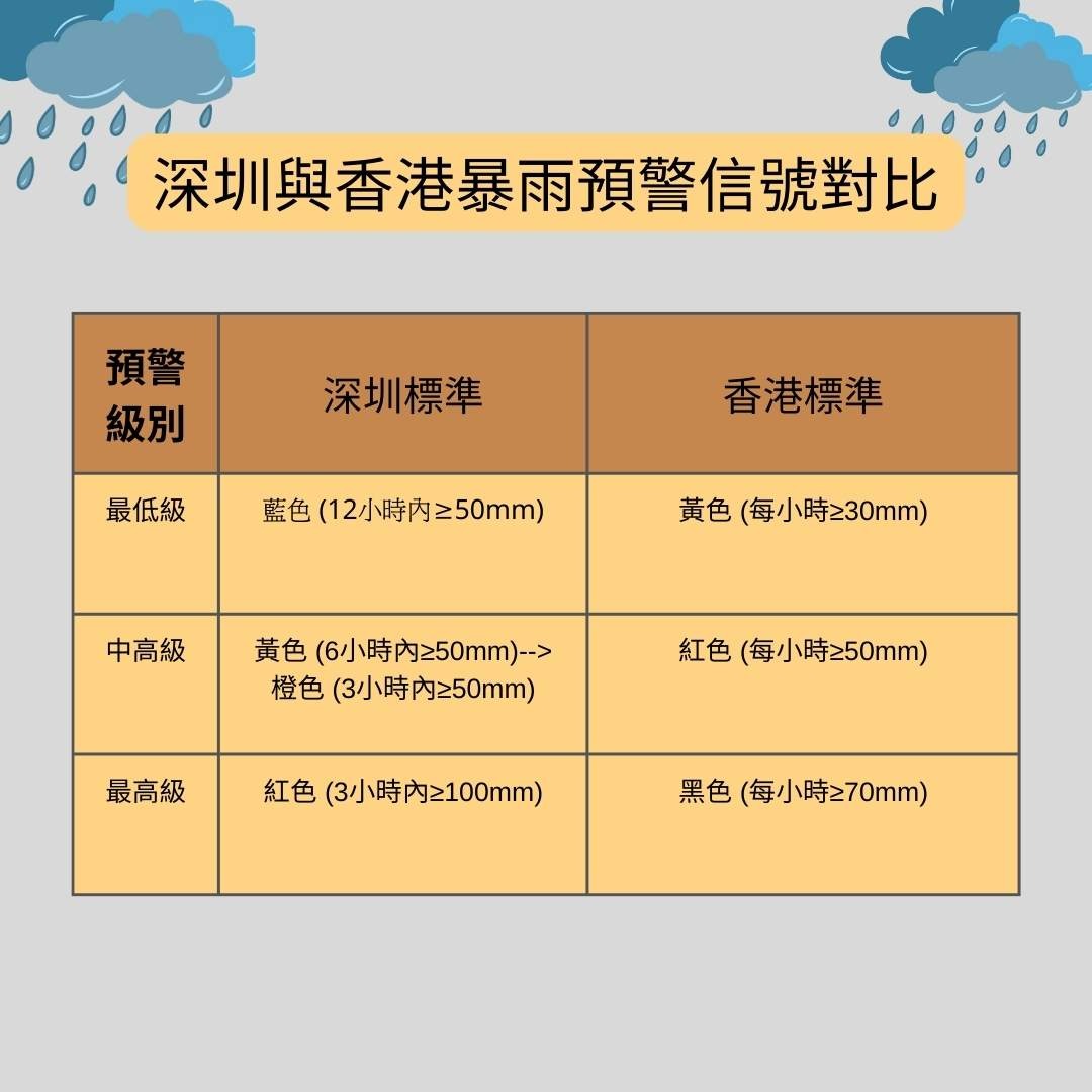 深圳位处的广东地区,特别容易受暴雨影响,便因应不同降雨量调整预警信号。