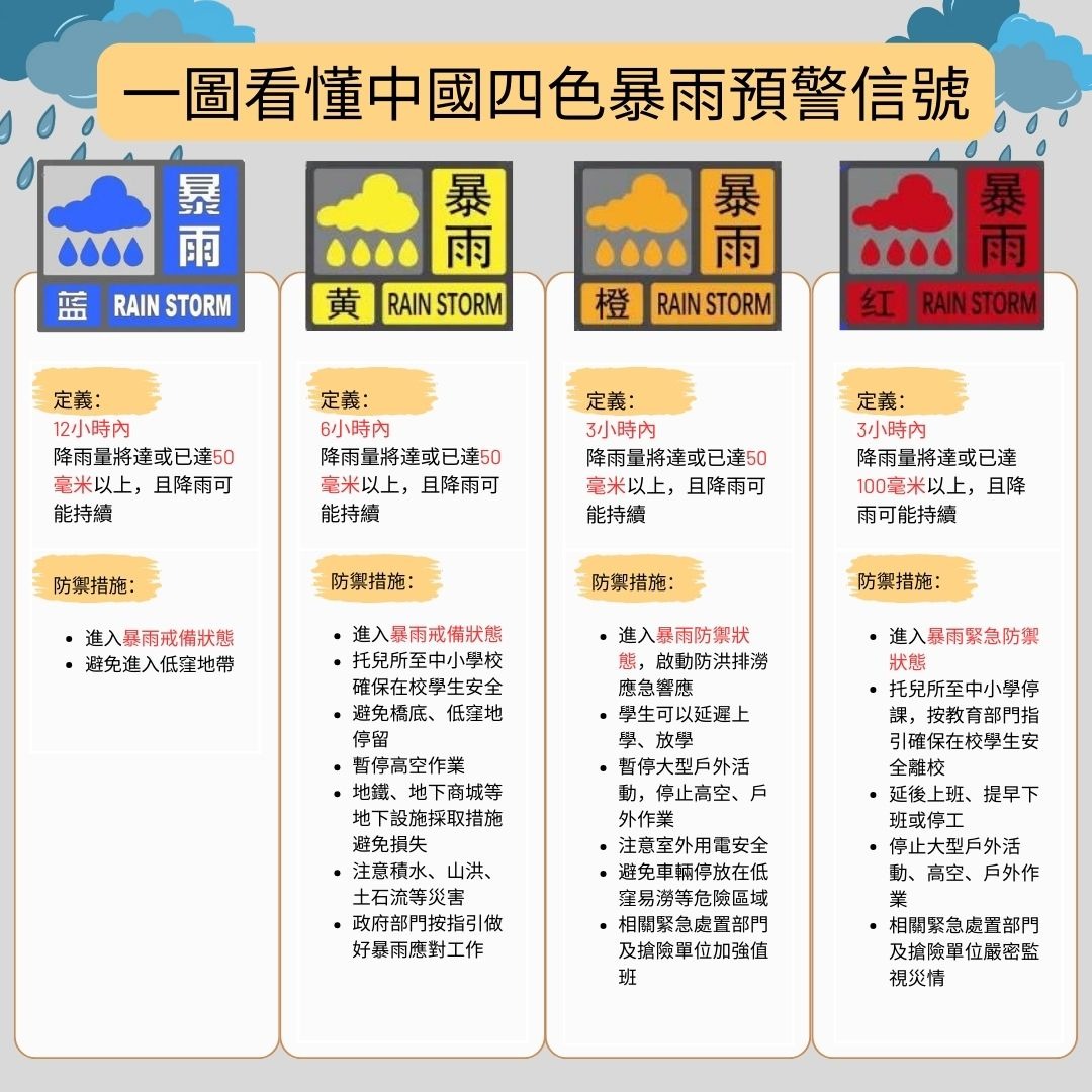 与香港一河之隔的深圳,也有一套以颜色区分的暴雨预警信号,全国通行,简称为“四色预警”信号。究竟有哪四种颜色?有怎样的御防措施指引?与香港又有什么不同呢?