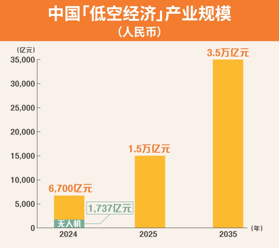 作为新兴领域,中国低空经济的产业规模非常惊人。最新数据显示,2024年中国低空经济产业总规模高达约6,700亿元(人民币.下同),2025年有望倍增至1.5万亿元人民币。到了2035年,更预计将突破3.5万亿元。