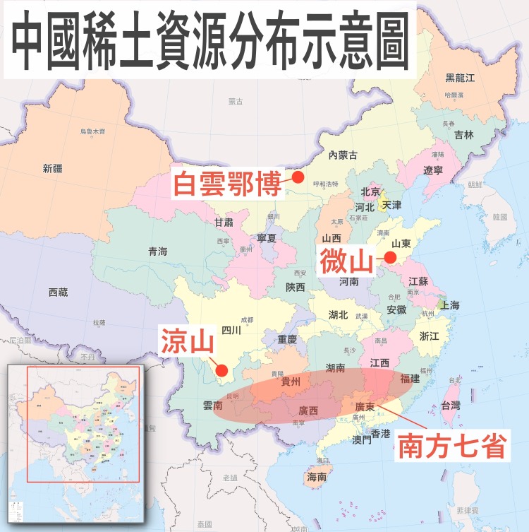 中国稀土资源主要集中在内蒙古自治区中部的包头市、四川的凉山一带、山东微山一带,以及分布在江西、湖南、广东、广西、福建、贵州和云南的南方七省。