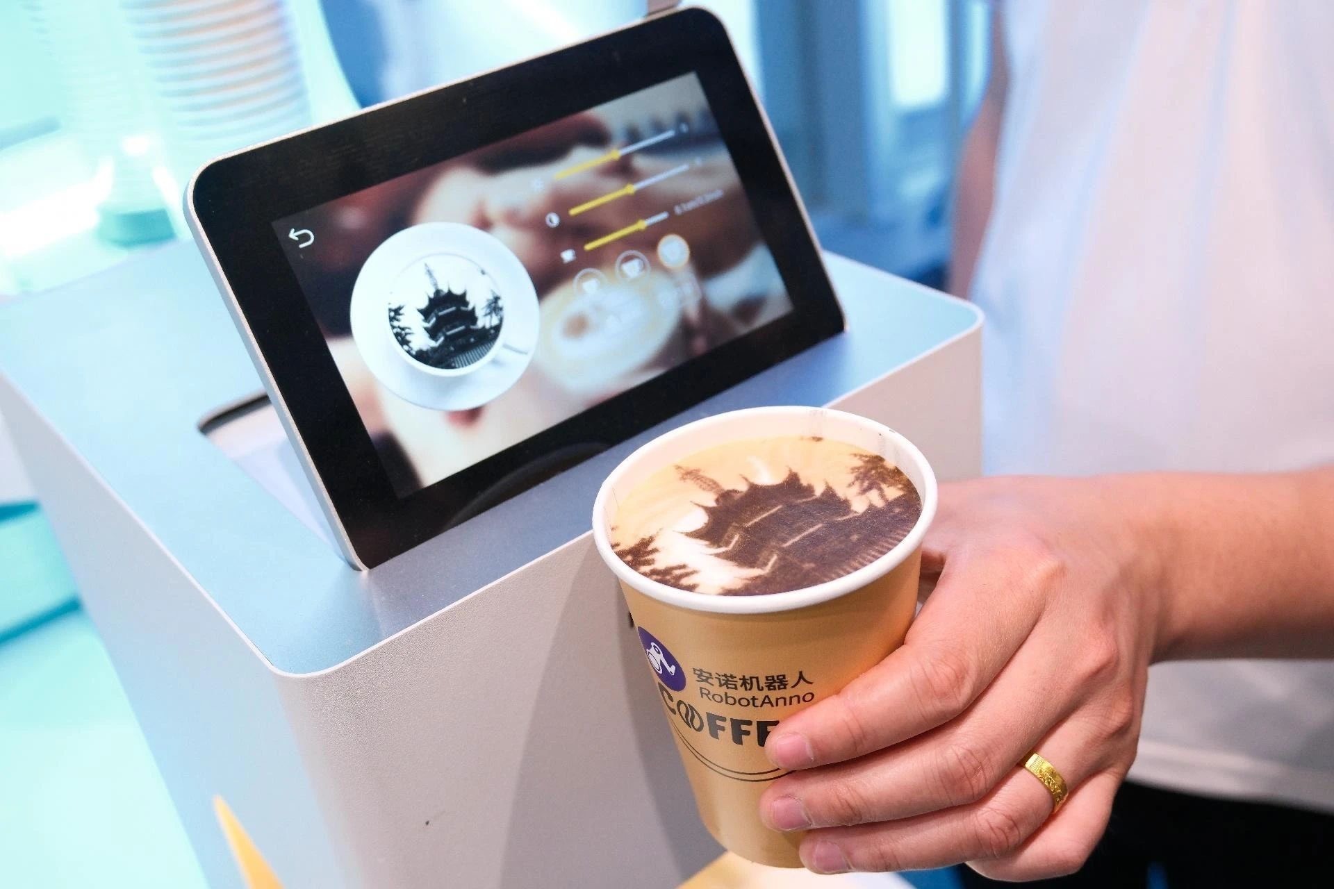店门入口是两台美食机器人:一台现场制作香脆煎饼果子,几分钟就能出品,味道不输一般摊档;另一台则售卖冰淇淋,有多款口味供选择。而店内,则有各式机器人现磨咖啡,还有拉花表演,均令人食指大动。