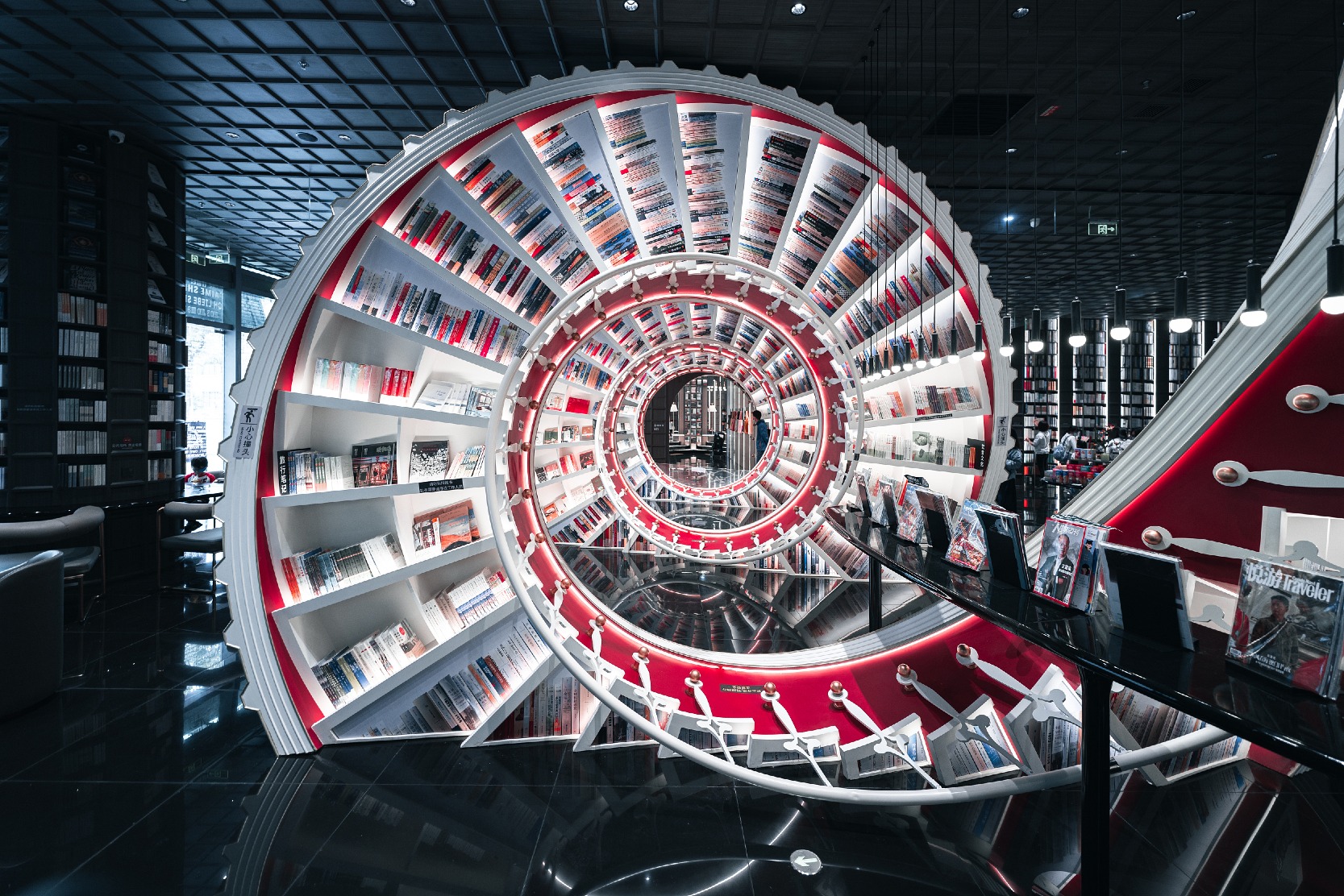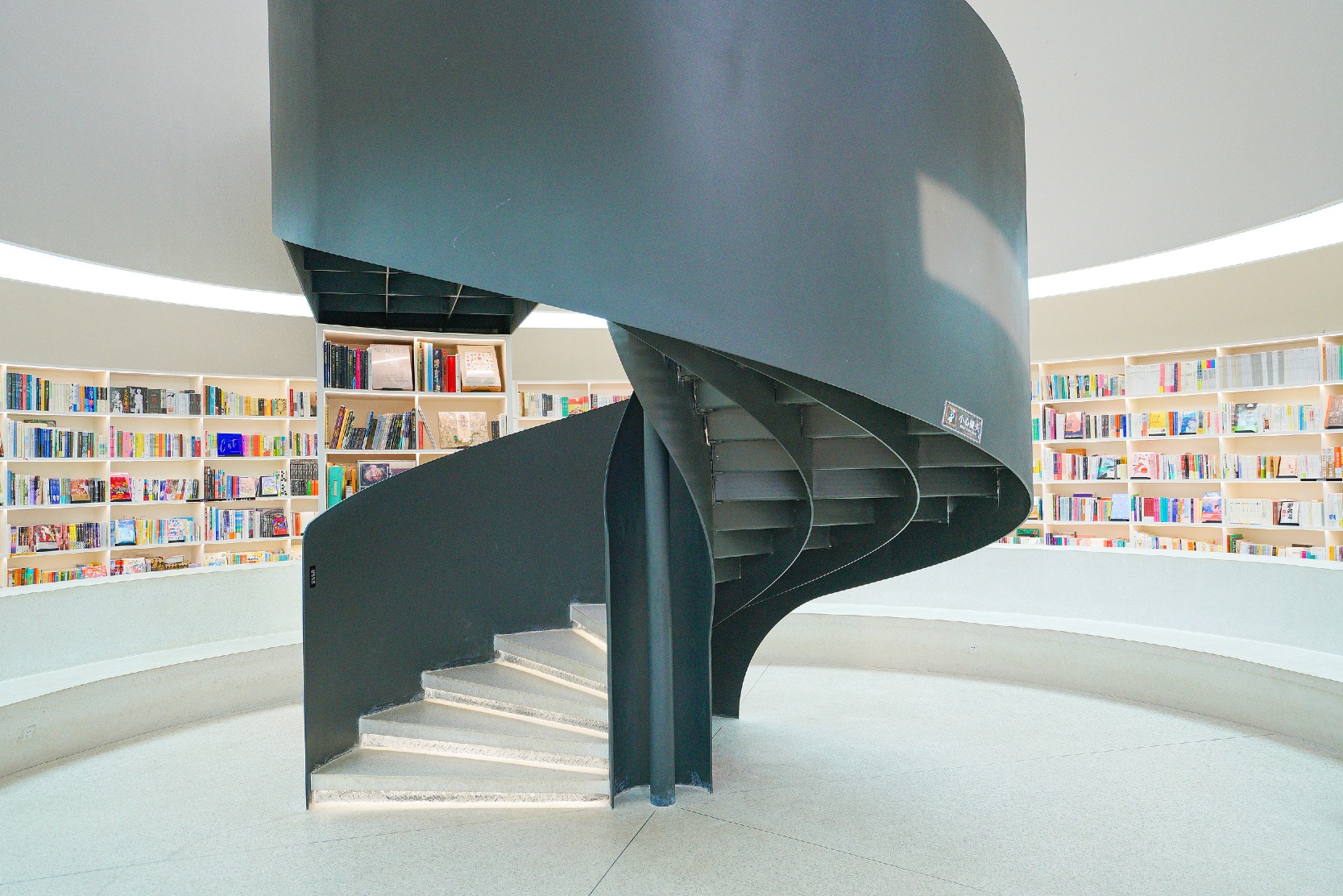 深圳钟书阁就坐落于华侨城欢乐港湾内,总面积约1,300平方米,连接出入口处的暗红色巨大螺旋楼梯书架,是这座钟书阁最大的亮点。
