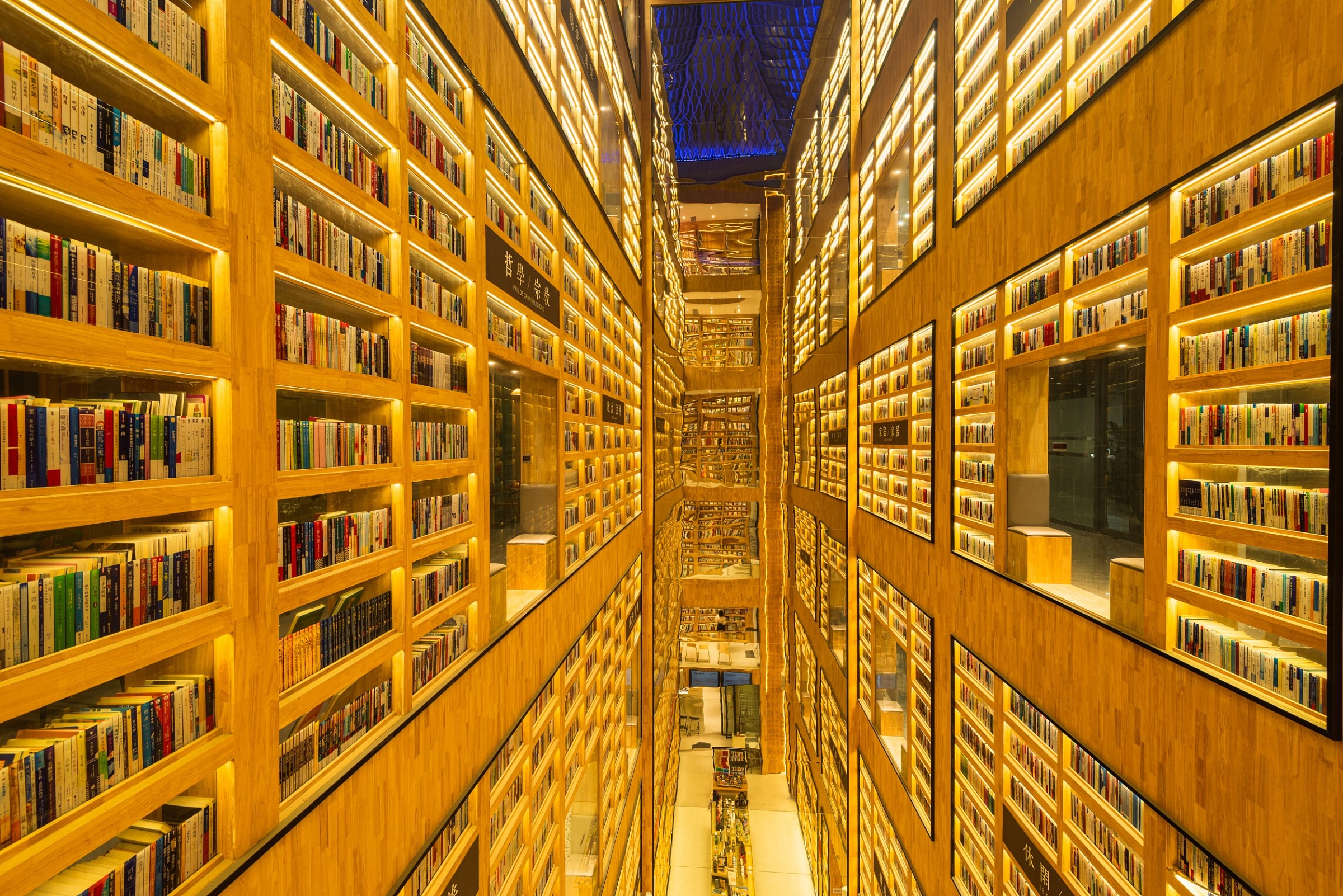 店内设计则呈现截然不同的现代风格──入口处一座高达30米的巨型原木色书墙巍然矗立,采用挑空式设计贯通每层空间,犹如置身于《哈利波特》的魔法世界之中,层层叠叠的书架陈列着各式图书,营造出强烈的视觉冲击。