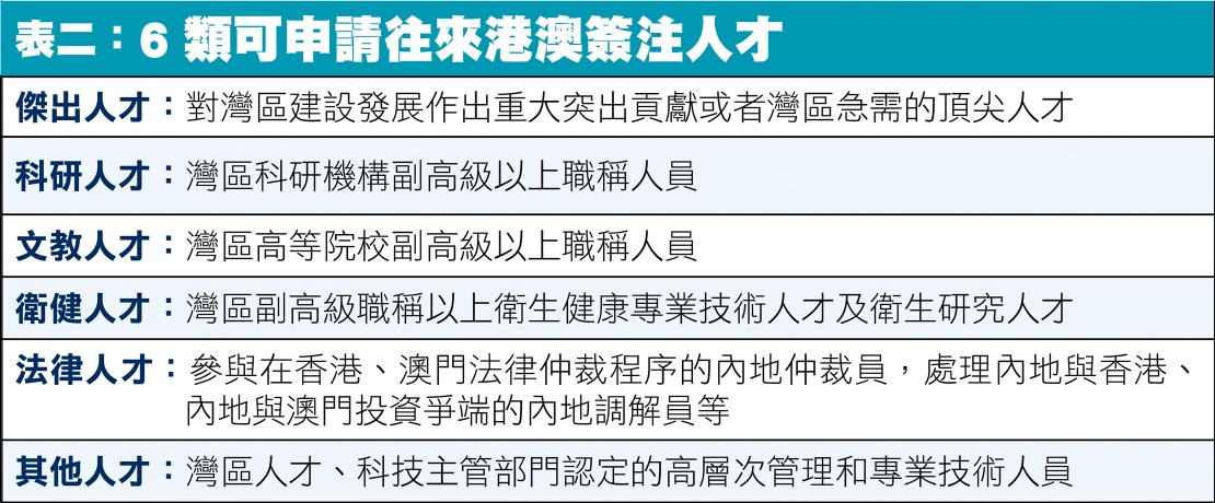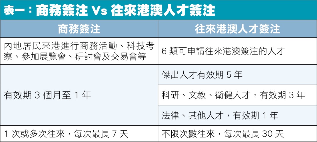内地新推出的“往来港澳人才签注”,让多项类别的人才可以申请由1年至5年的签注,不限次数往来,而且每次最长可以停留30天(表一)。
