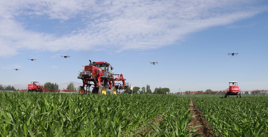 图摄于2021年6月的甘肃张掖五个墩村的种植粟米田,农民正利用现代化机械包括粟米收割机和无人喷农药机等,有效率地加快粟米生产。(图片来源:视觉中国)