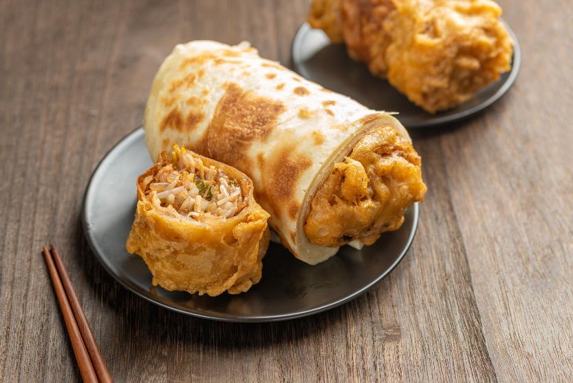 在天津街边常买到的“卷圈”,曾经是过去售卖豆浆的早餐舖的副产品。豆浆长时间熬煮,表面会形成一块油皮,揭起晾干后,再裹住豆芽菜、胡萝卜丝、香菜、豆干、粉条、酱豆腐和麻酱,用面糊把豆皮卷的接合位和两头封口,就可以用热油炸熟。卷圈外脆里香,蔬菜的水分被充分锁住,吃起来口感丰富,加上大饼作为必备配搭,久而久之成为天津特色早餐之一。而自八十年代以后,可能因为制作麻烦,制作卷圈用的豆皮,逐渐被替换成面皮、馄饨皮或春卷皮。