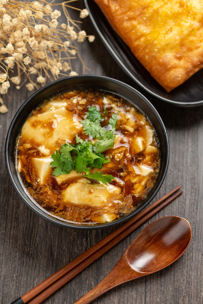 在天津,在街上能找到看似是酸辣汤的汤品,就是当地的传统早餐——老豆腐。天津的老豆腐,事实上和北方惯常吃的咸口豆腐花差不多,只不过卤汁和做法细节稍有不同。把一大砖嫩豆腐放在碗中间,在豆腐面划个十字,再浇上卤汁、麻酱,还有韭菜花、蒜泥等佐料,便成为了老豆腐。天津老豆腐重点在于制卤,需选用黑木耳、香菇、黄花菜,加上酱油煮成浓稠的汁。老豆腐入口即化,这醇厚咸香的味道和顺滑的口感,便藏着无数天津人的清晨记忆。