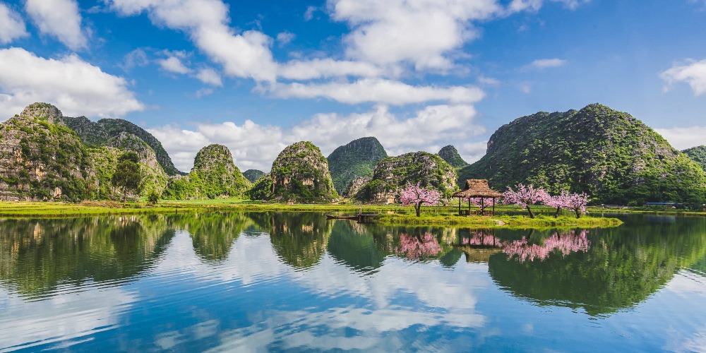其中《三生三世十里桃花》取景地位于景区内的菜花箐村,桃花岛背后是数座圆头形峰丛,还有绿油油的水生植物,山峰前是清澈见底的普者黑湖泊,单看风景已是一幅令人惊叹的山水画。再者,桃花岛上栽种桃花树及搭建茅草亭,群山、桃花树及茅草亭倒咉在湖中,实在是一处极致的桃花源美景。
