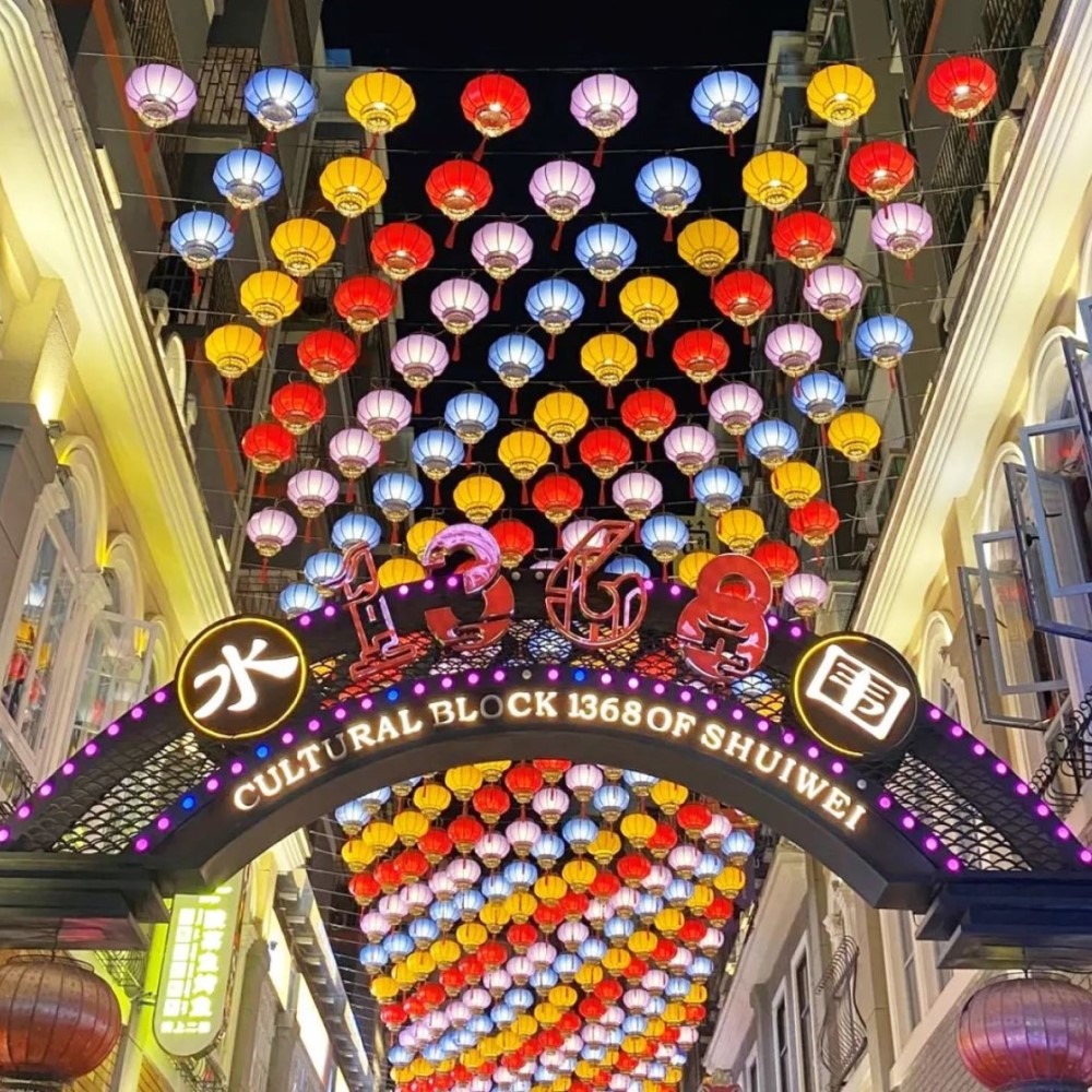 在落马洲站下车过关后,到福田口岸站B出口步行几分钟,抬头看到一排整齐雅致的七彩纸灯笼,这里便是福田的新蒲点“水围1368文化街区”了。