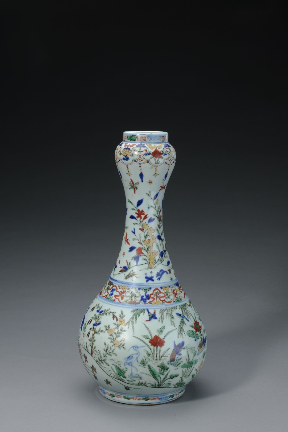 The stunning treasures includes a pear-shaped vase with "Three Friends of Winter" from the Hongwu period (1368–1398), a dish with dragons among waves from the Xuande period (1426–1435), a cup with garden scenes in autumn, from the Chenghua period (1465–1487), and a garlic-mouth bottle with birds and flowers, from the Wanli period (1537–1620).