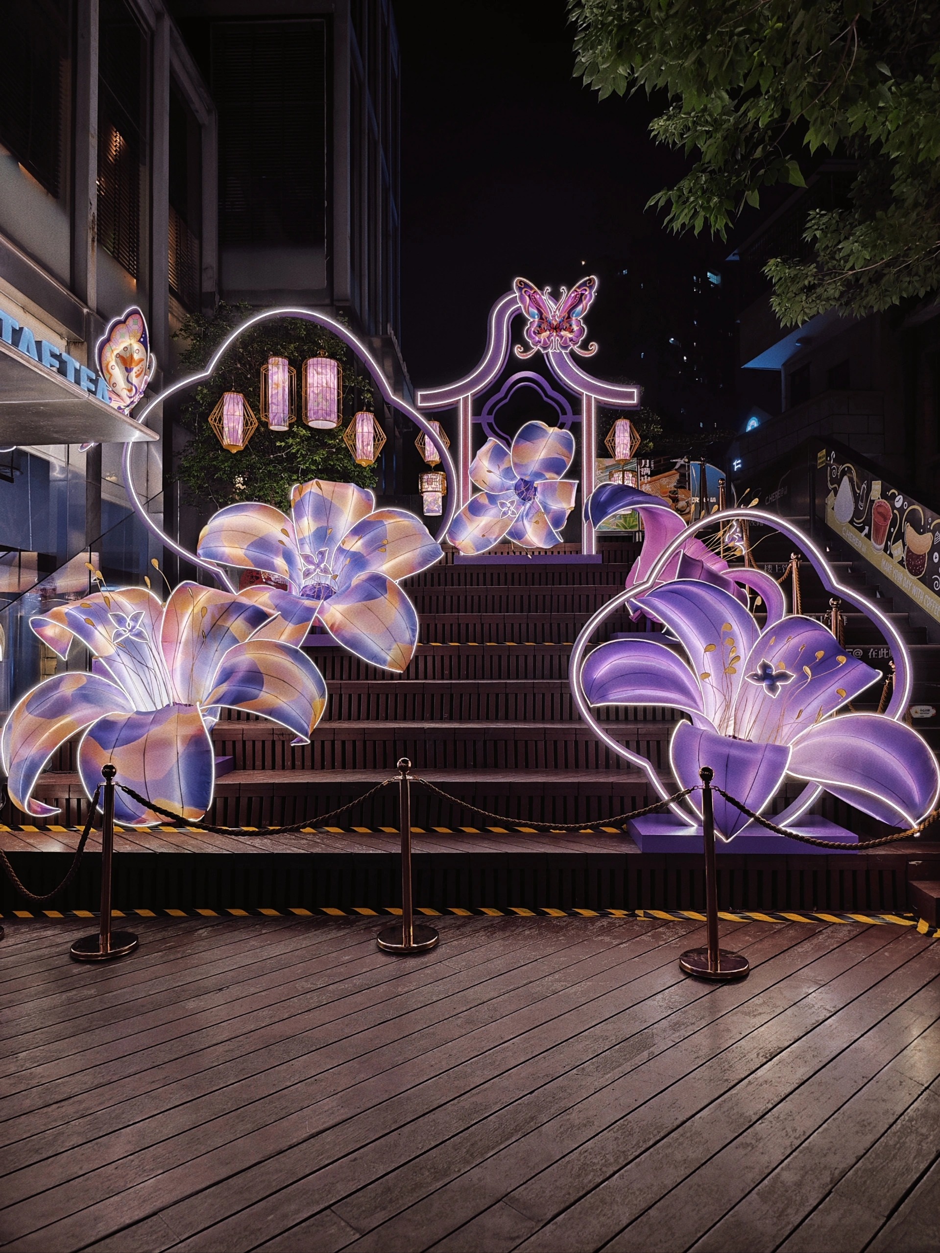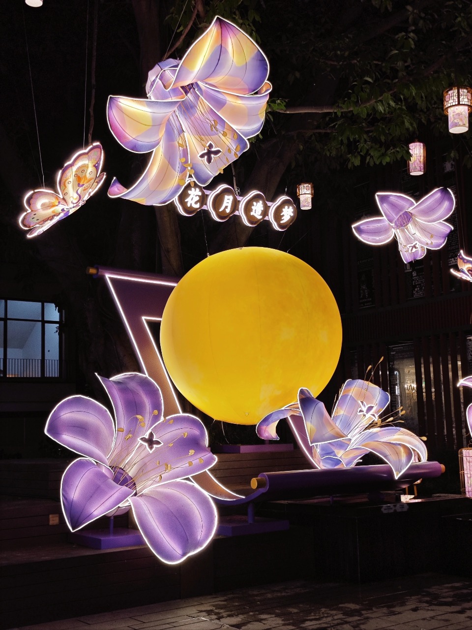 The lantern designs have evolved from giant fish to lovely magnolia flowers and butterflies. The lights are dazzling, as if stepping into a world of flowers, fantastical and enchanting.